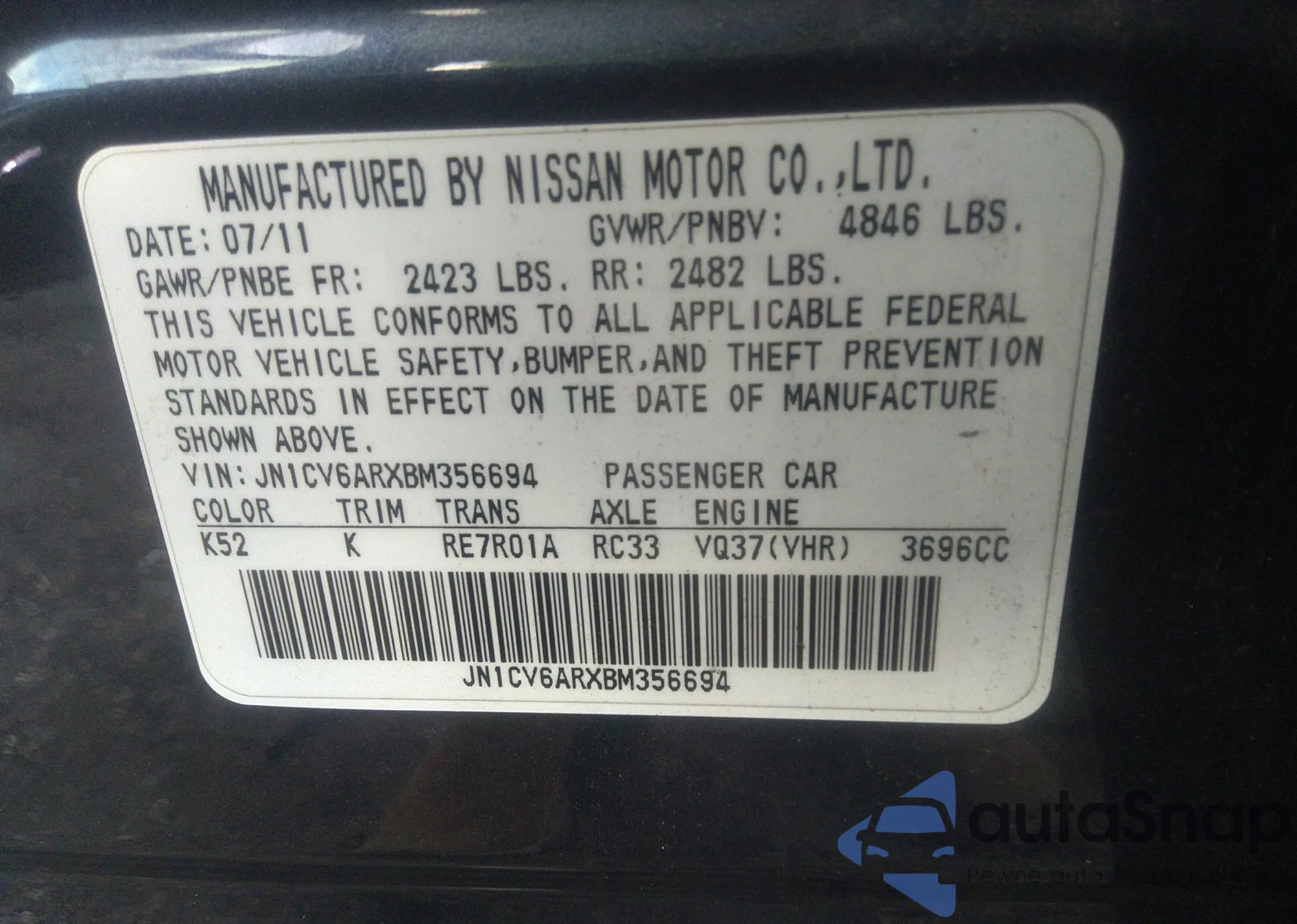• VIN JN1CV6ARXBM356694
