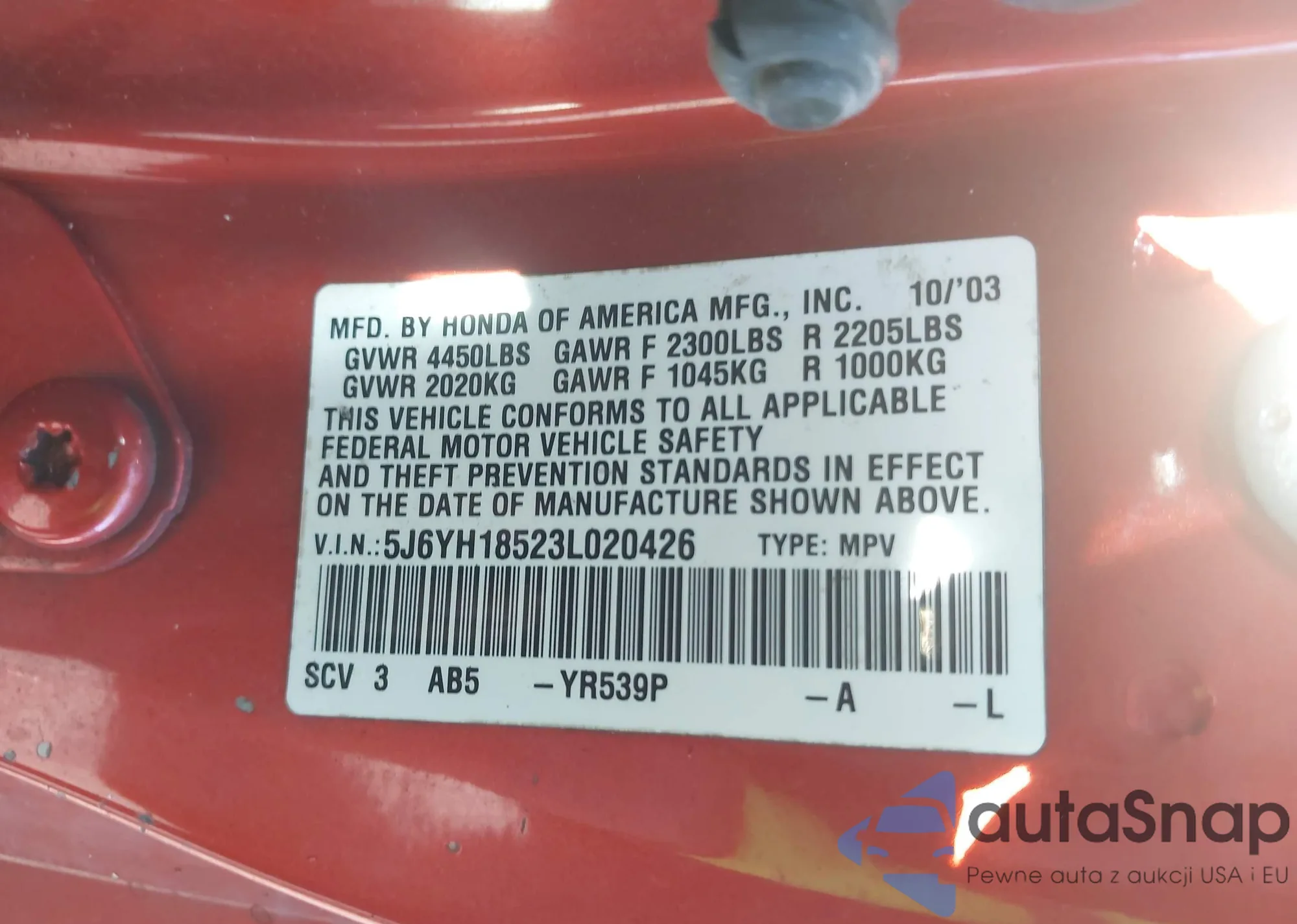 • VIN 5J6YH18523L020426