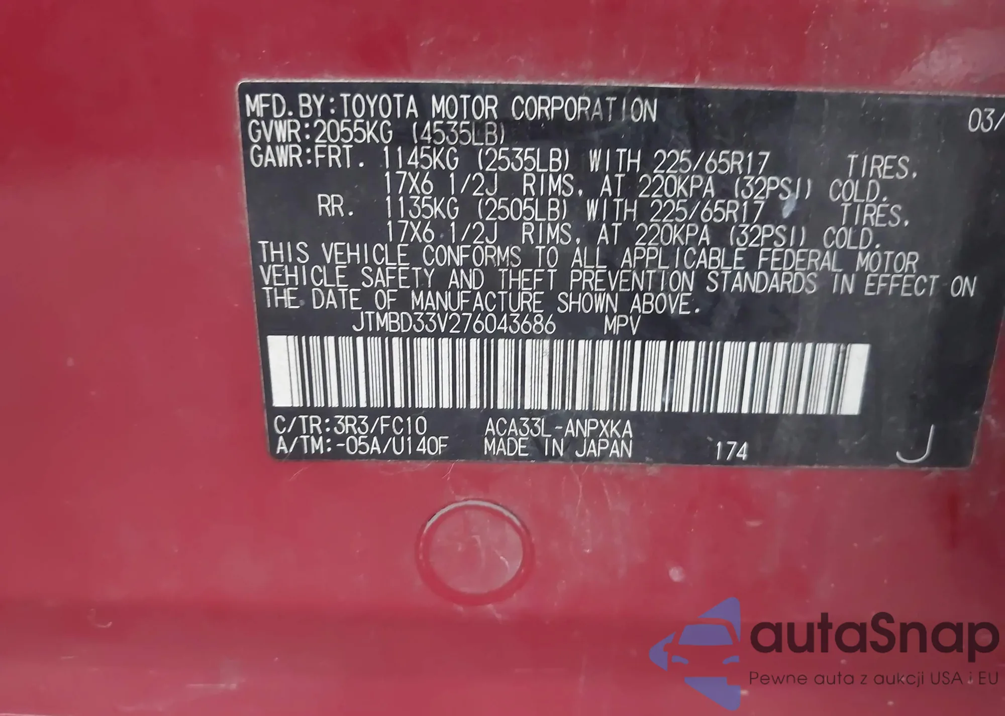 LOT: 43331532 VIN: JTMBD33V276043686