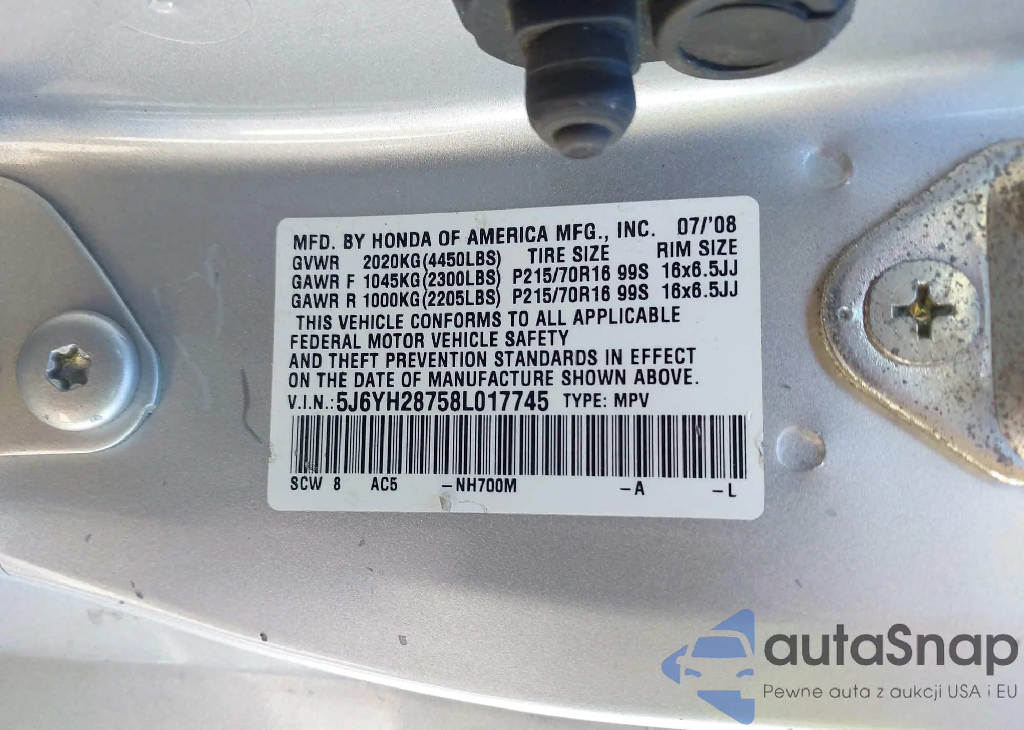• VIN 5J6YH28758L017745
