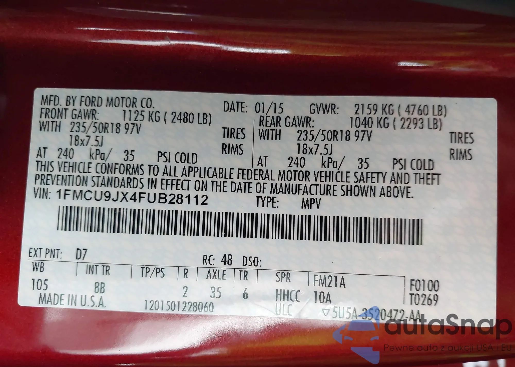 • VIN 1FMCU9JX4FUB28112