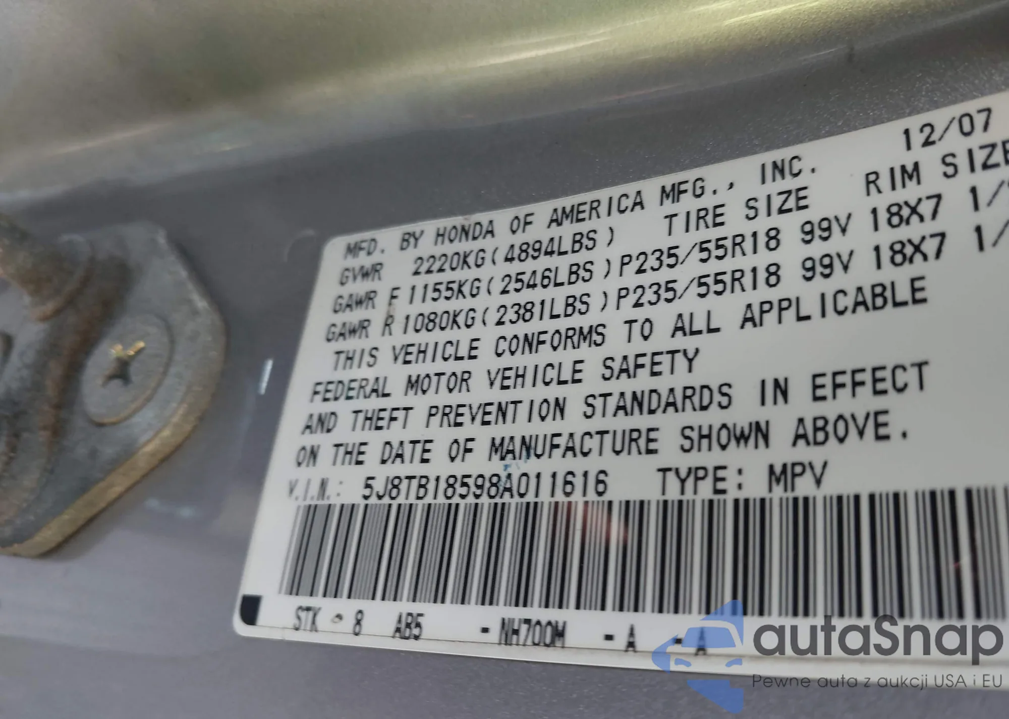 LOT: 43118244 VIN: 5J8TB18598A011616