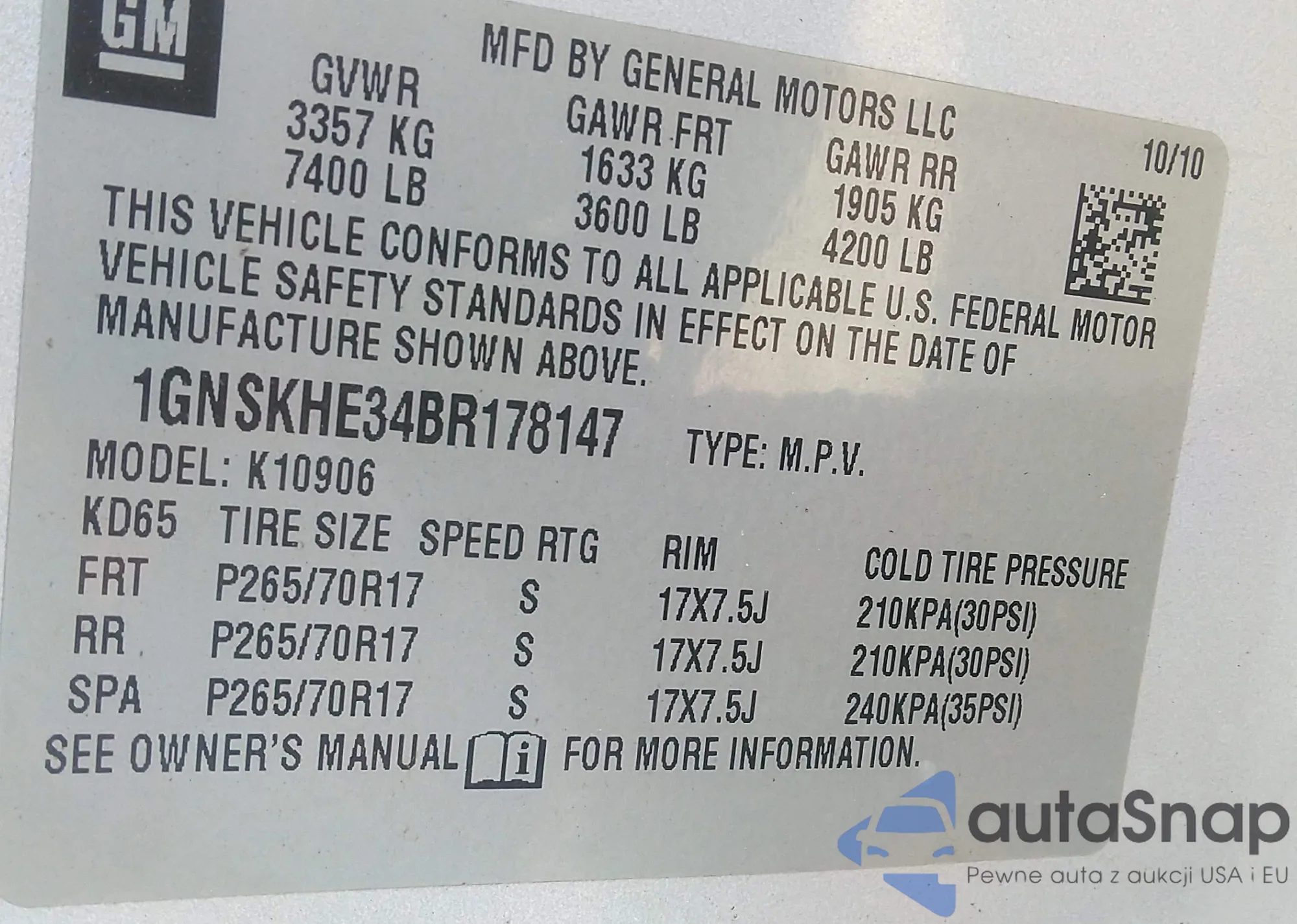 LOT: 43136207 VIN: 1GNSKHE34BR178147