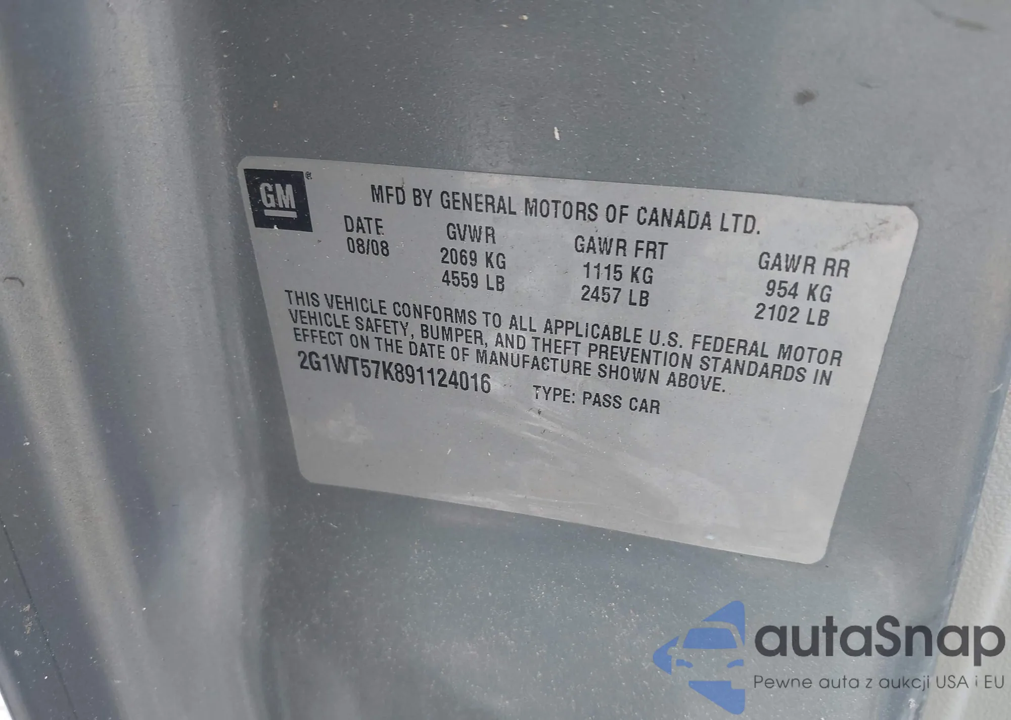 • VIN 2G1WT57K891124016