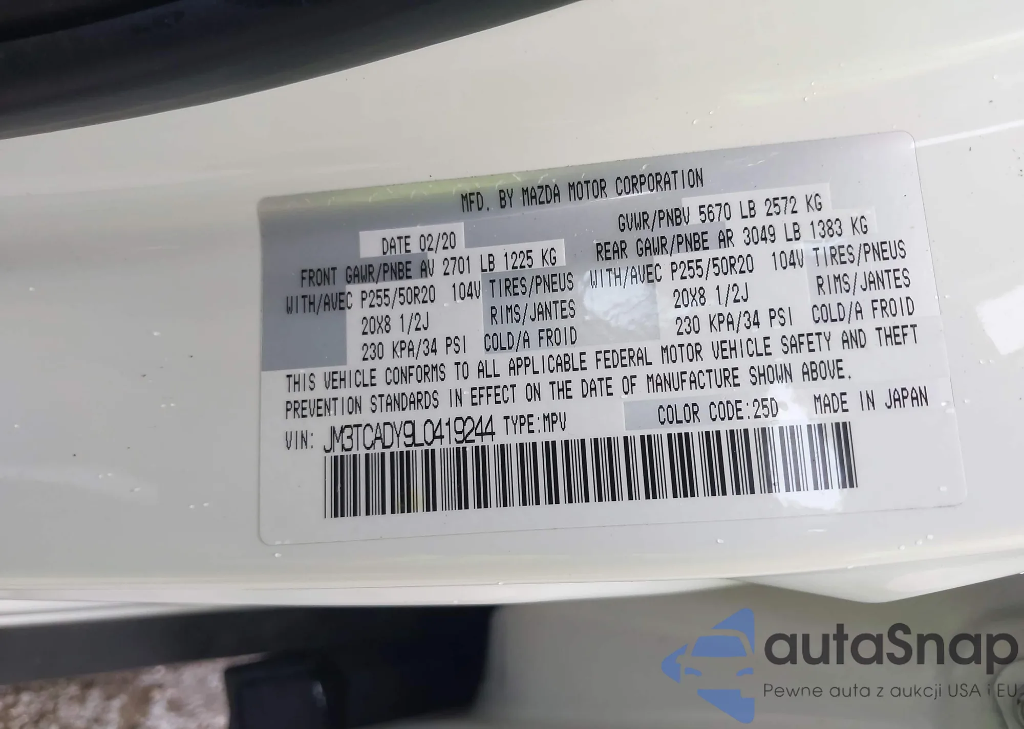 LOT: 43190718 VIN: JM3TCADY9L0419244