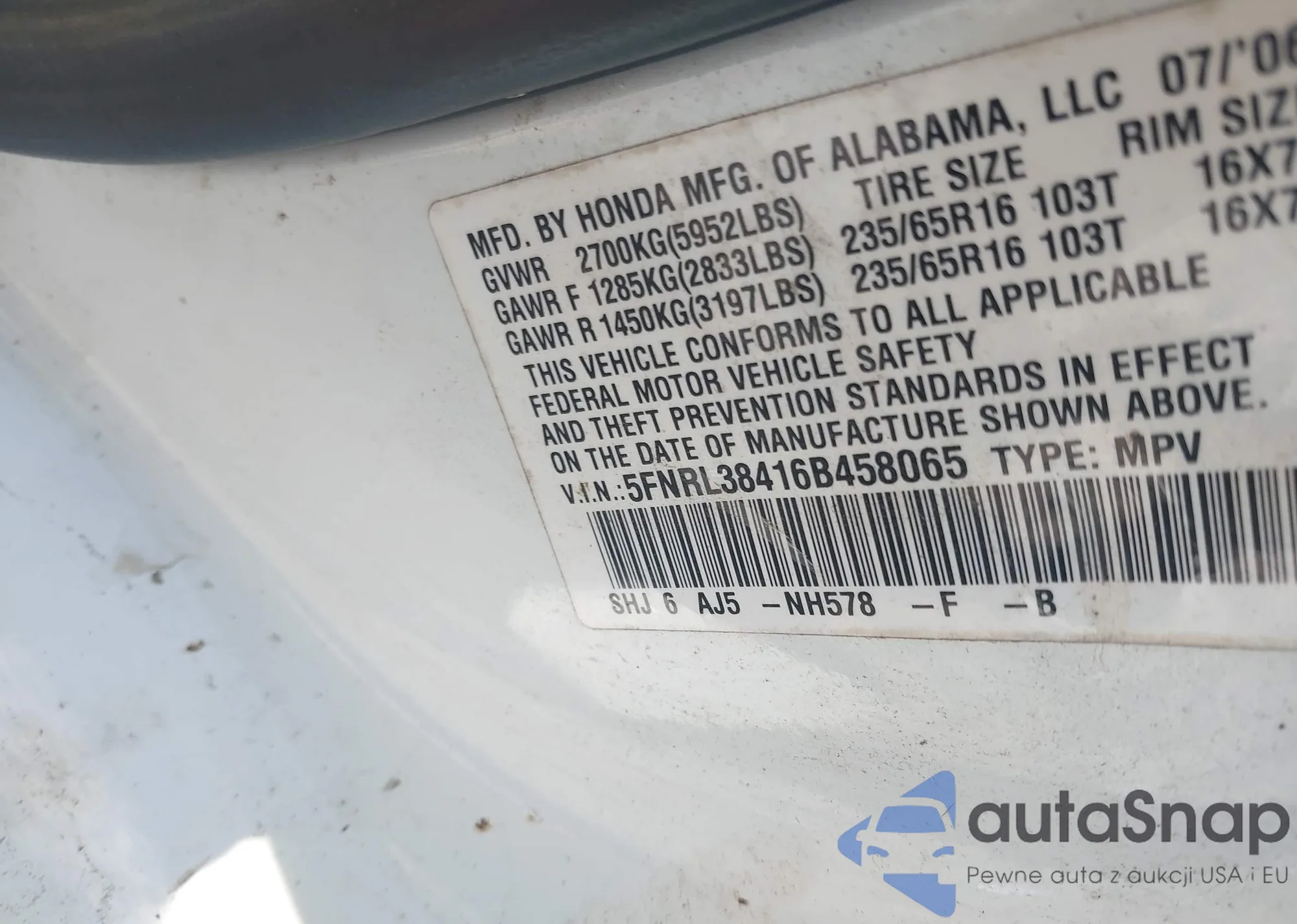 • VIN 5FNRL38416B458065