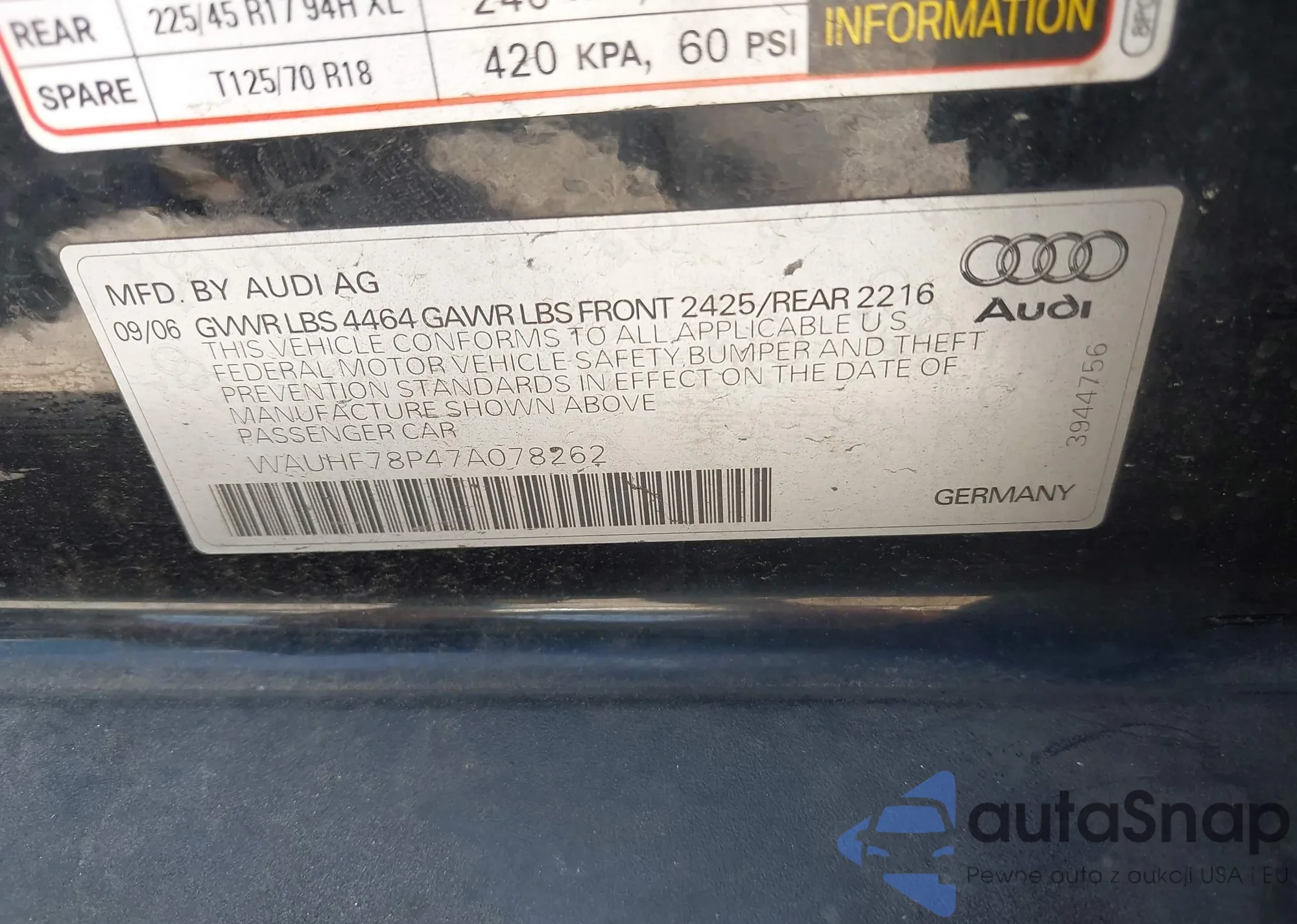 LOT: 42938373 VIN: WAUHF78P47A078262