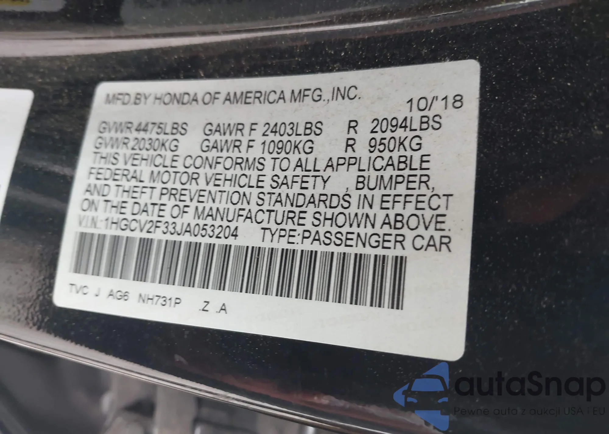 LOT: 42946660 VIN: 1HGCV2F33JA053204