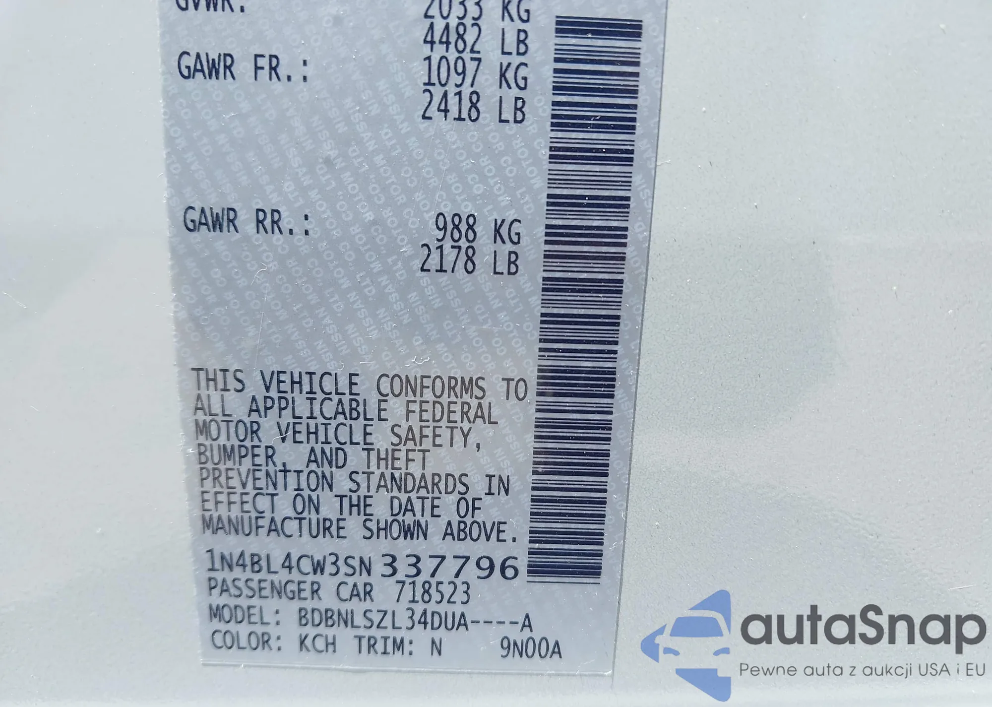 LOT: 42805777 VIN: 1N4BL4CW3SN337796