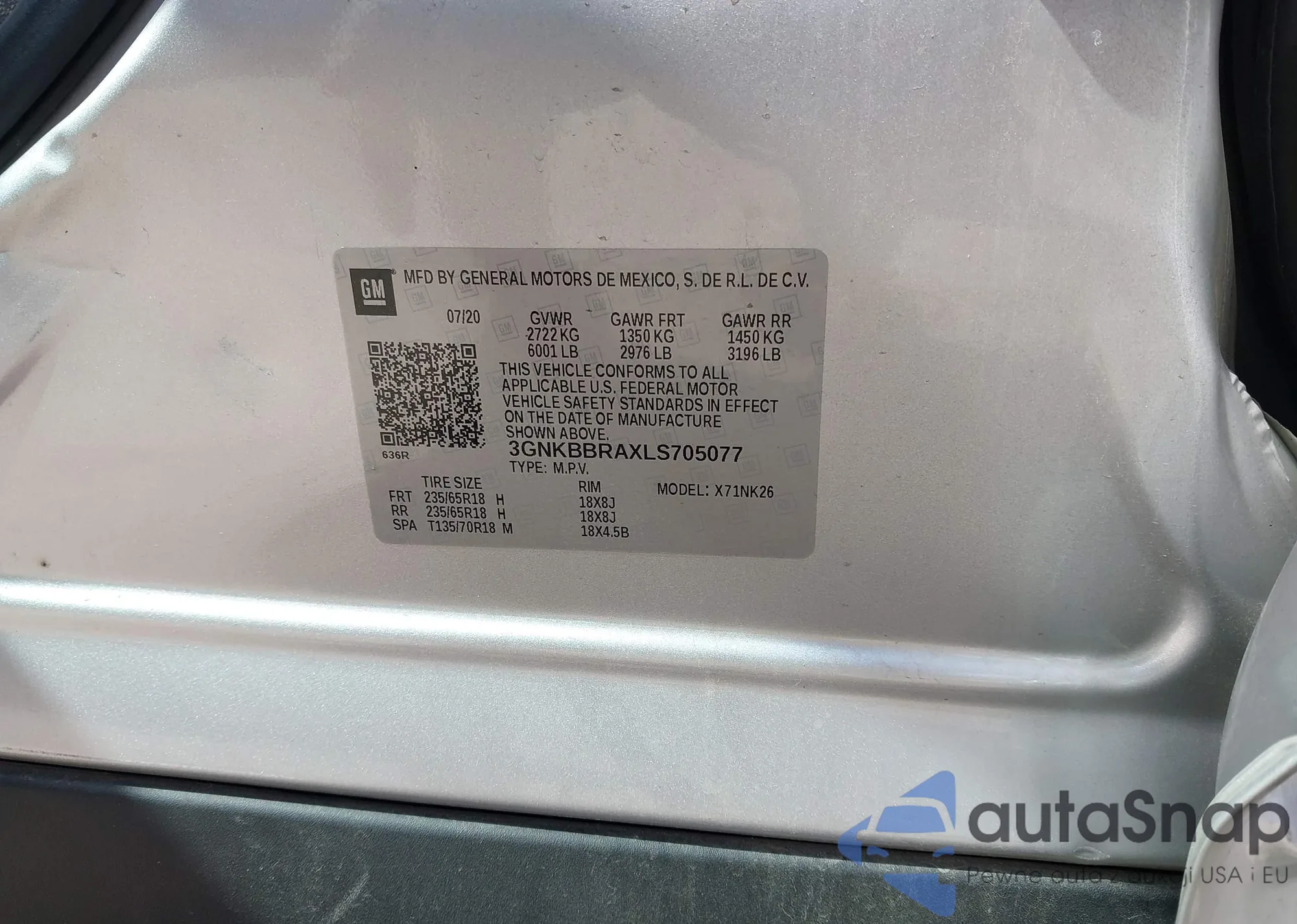 • VIN 3GNKBBRAXLS705077