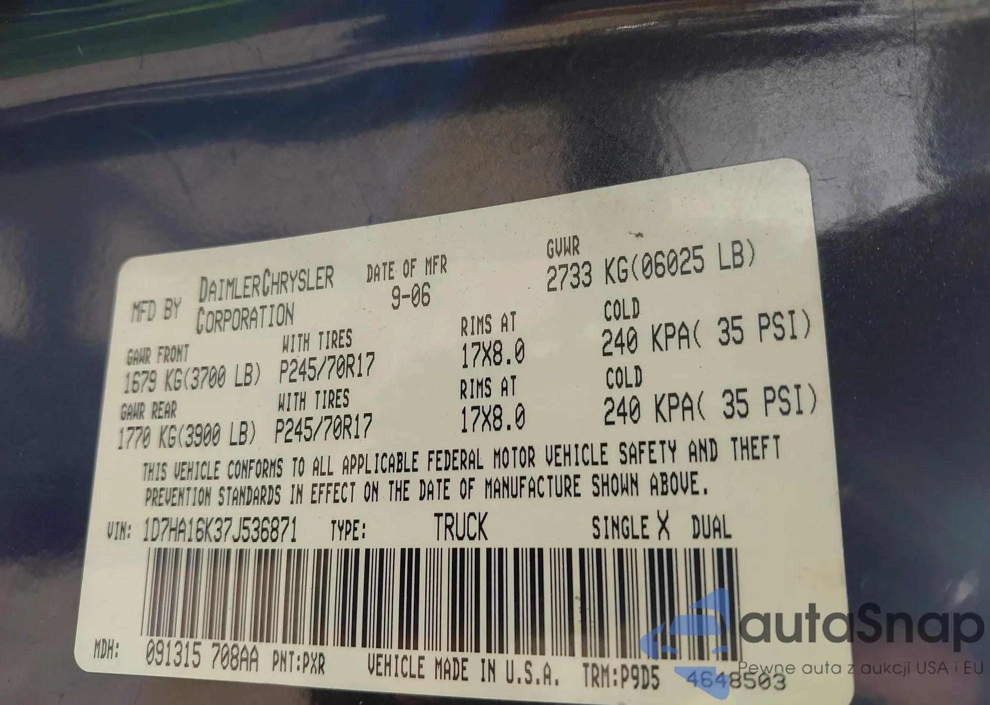 LOT: 43307582 VIN: 1D7HA16K37J536871