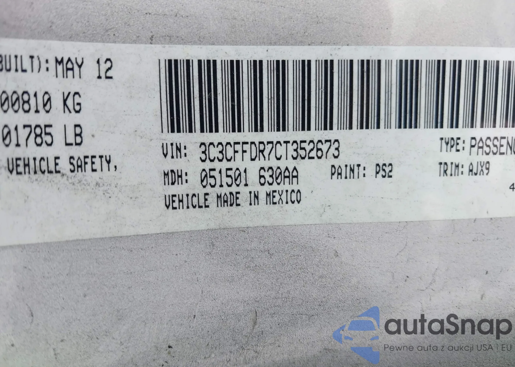LOT: 43312503 VIN: 3C3CFFDR7CT352673