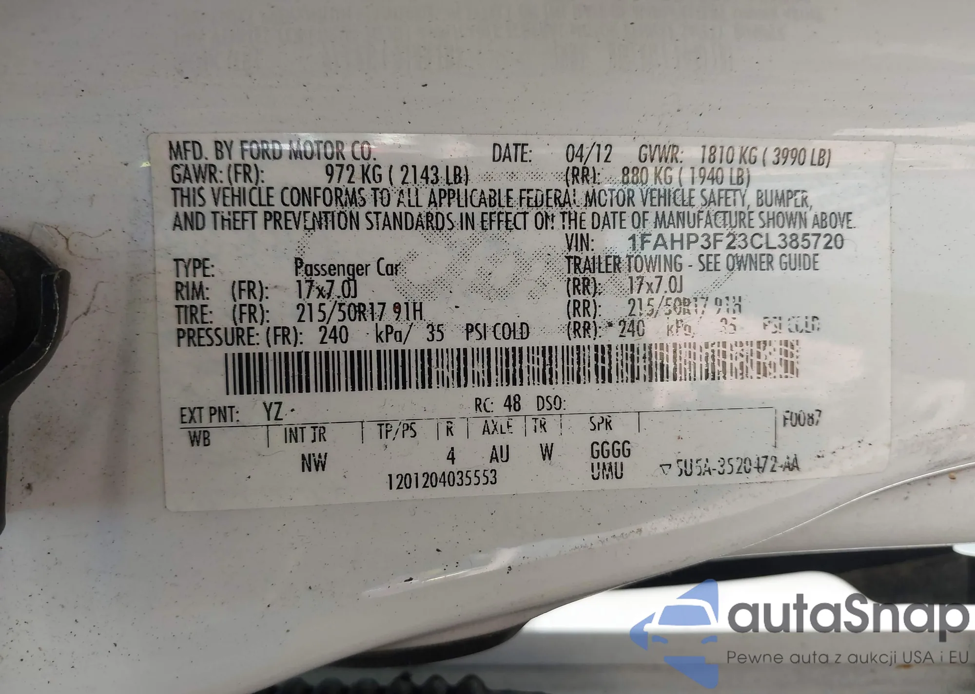 LOT: 43198538 VIN: 1FAHP3F23CL385720