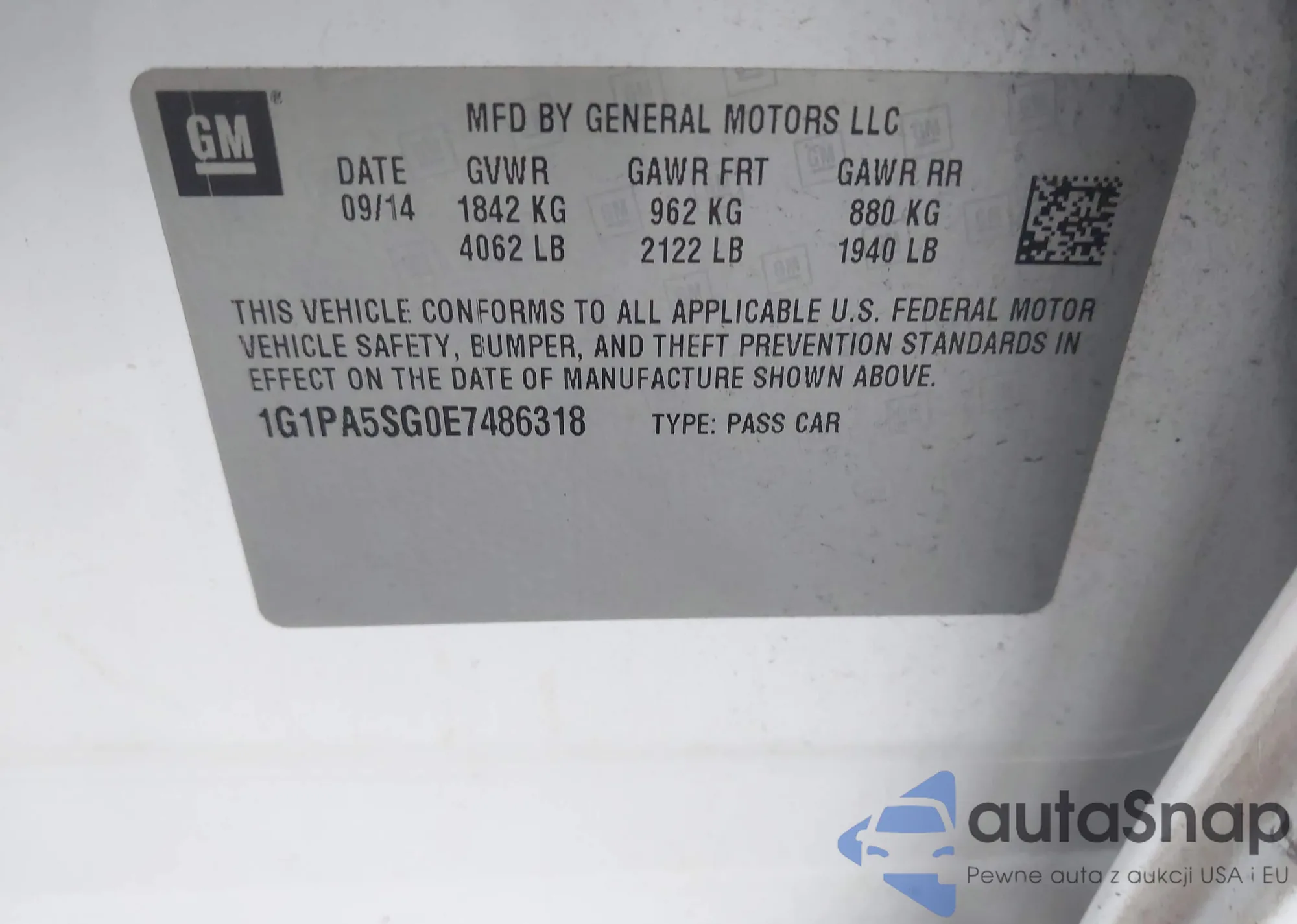 LOT: 43284496 VIN: 1G1PA5SG0E7486318