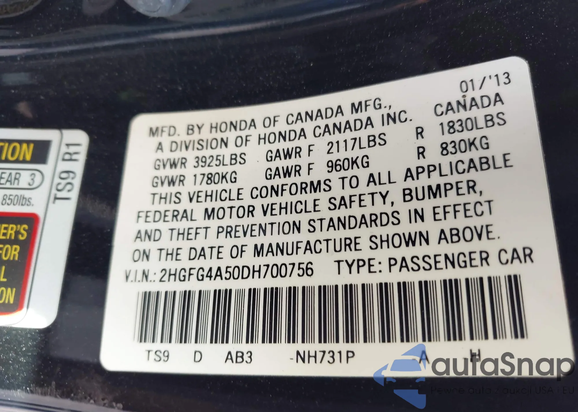 LOT: 43380815 VIN: 2HGFG4A50DH700756