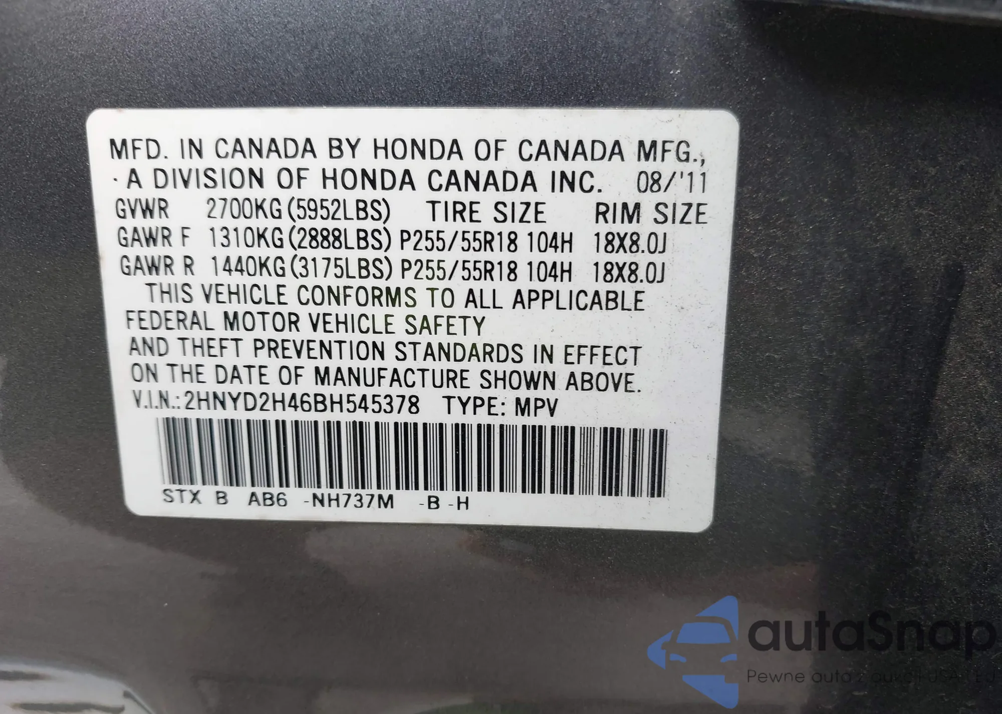 • VIN 2HNYD2H46BH545378