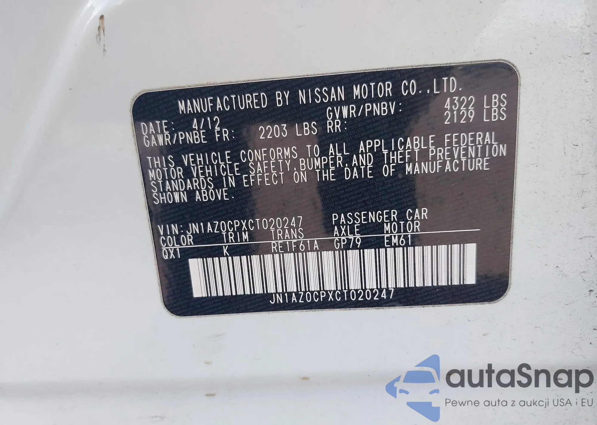 LOT: 43254353 VIN: JN1AZ0CPXCT020247