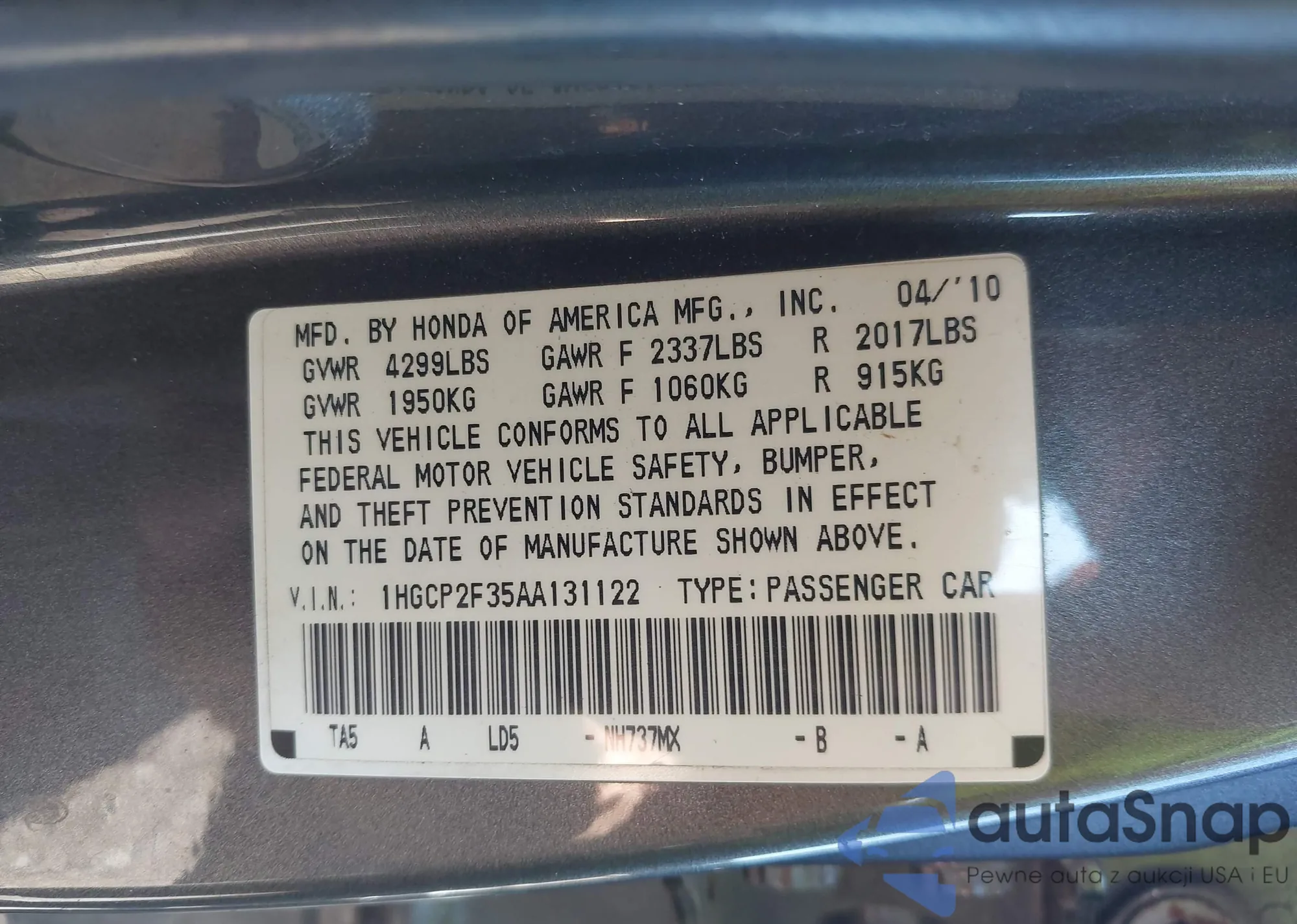 LOT: 43046189 VIN: 1HGCP2F35AA131122