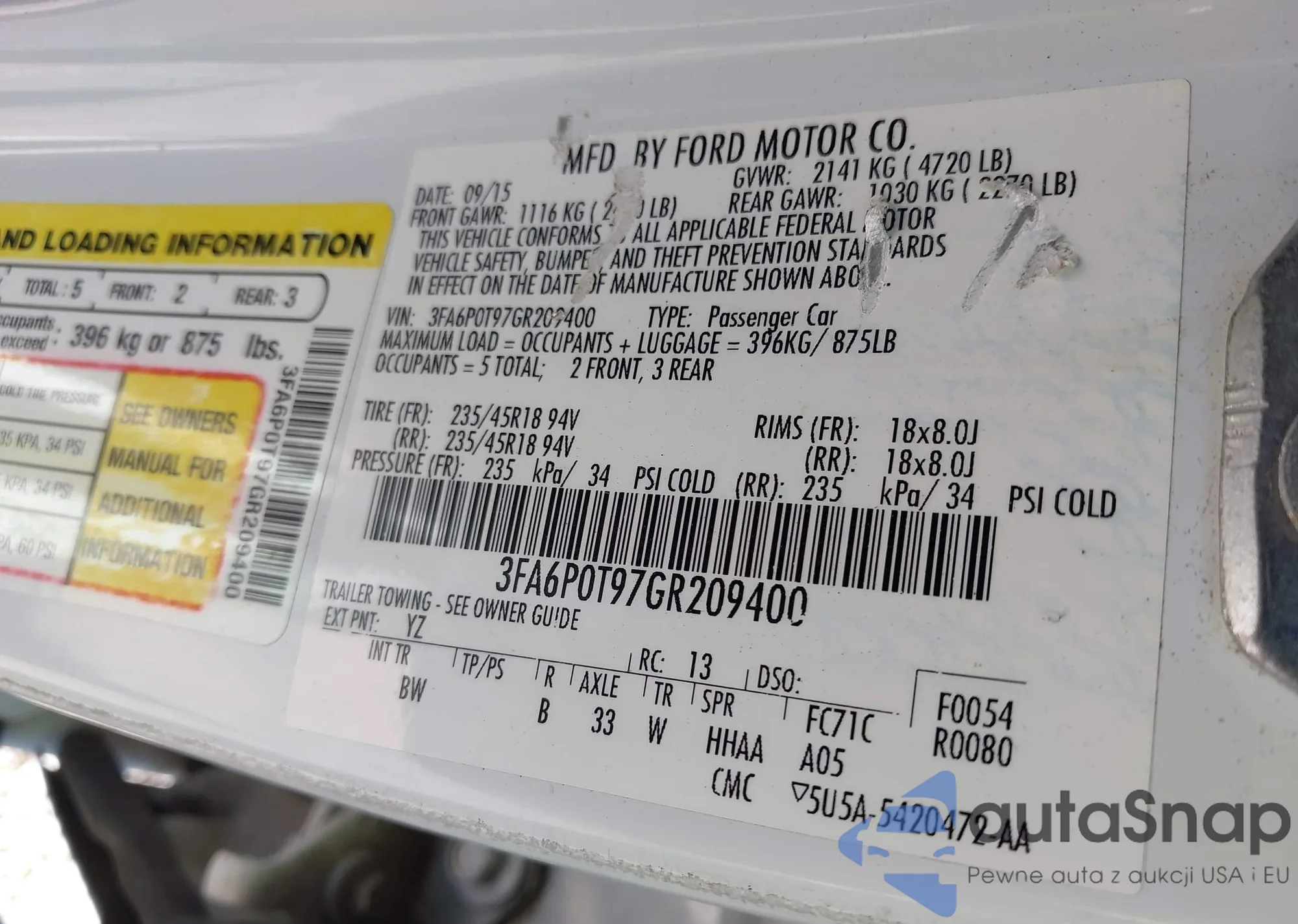 LOT: 43276635 VIN: 3FA6P0T97GR209400
