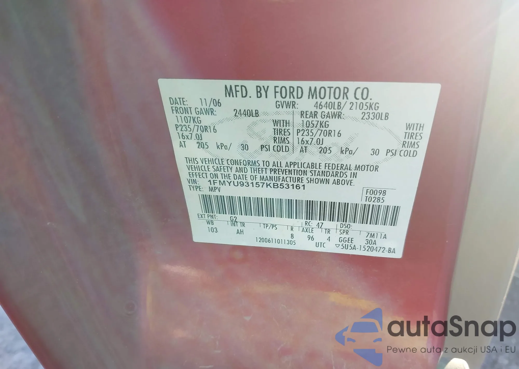 • VIN 1FMYU93157KB53161