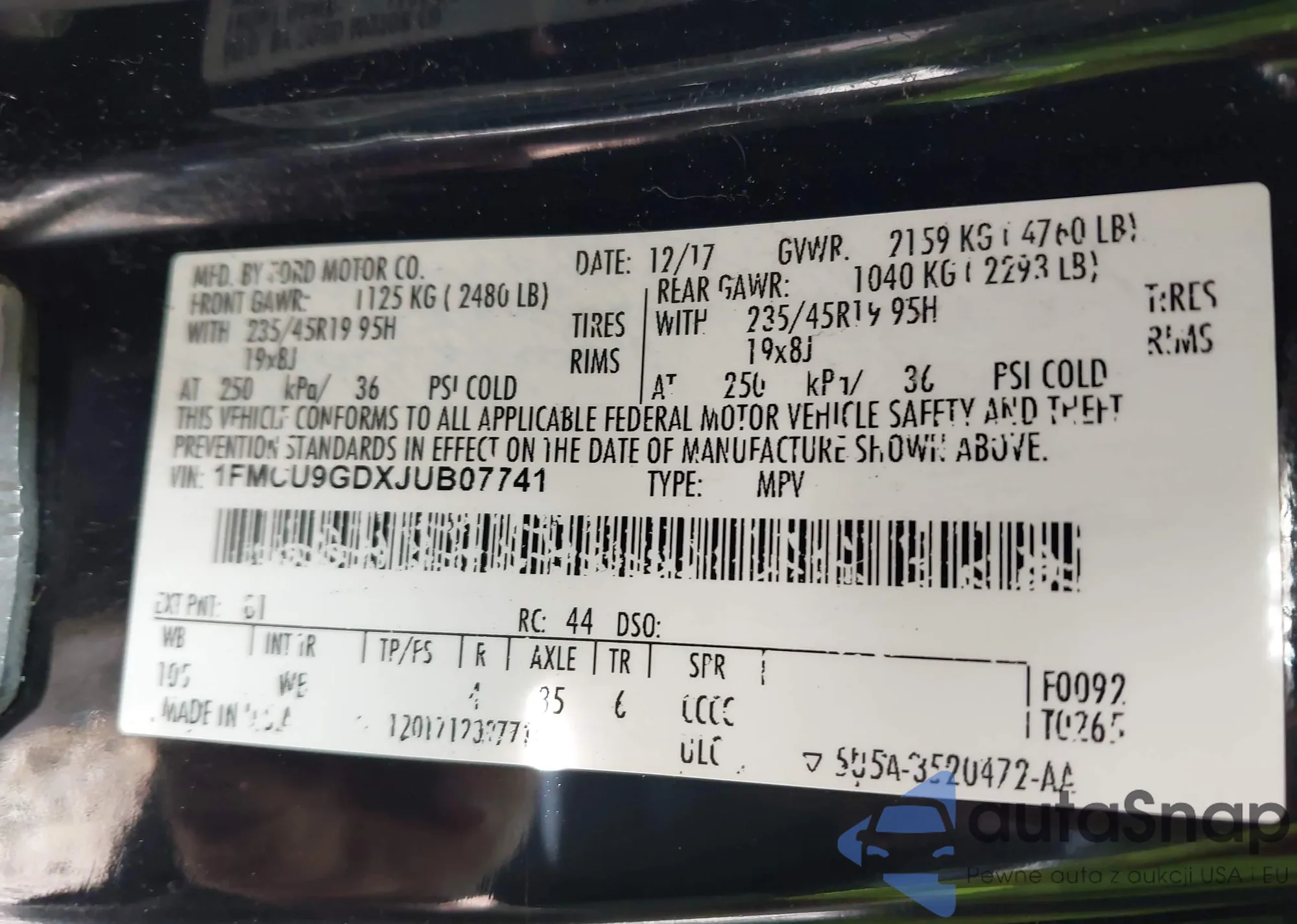 • VIN 1FMCU9GDXJUB07741