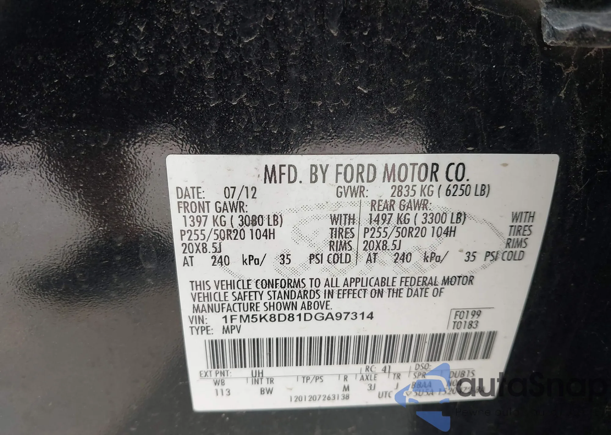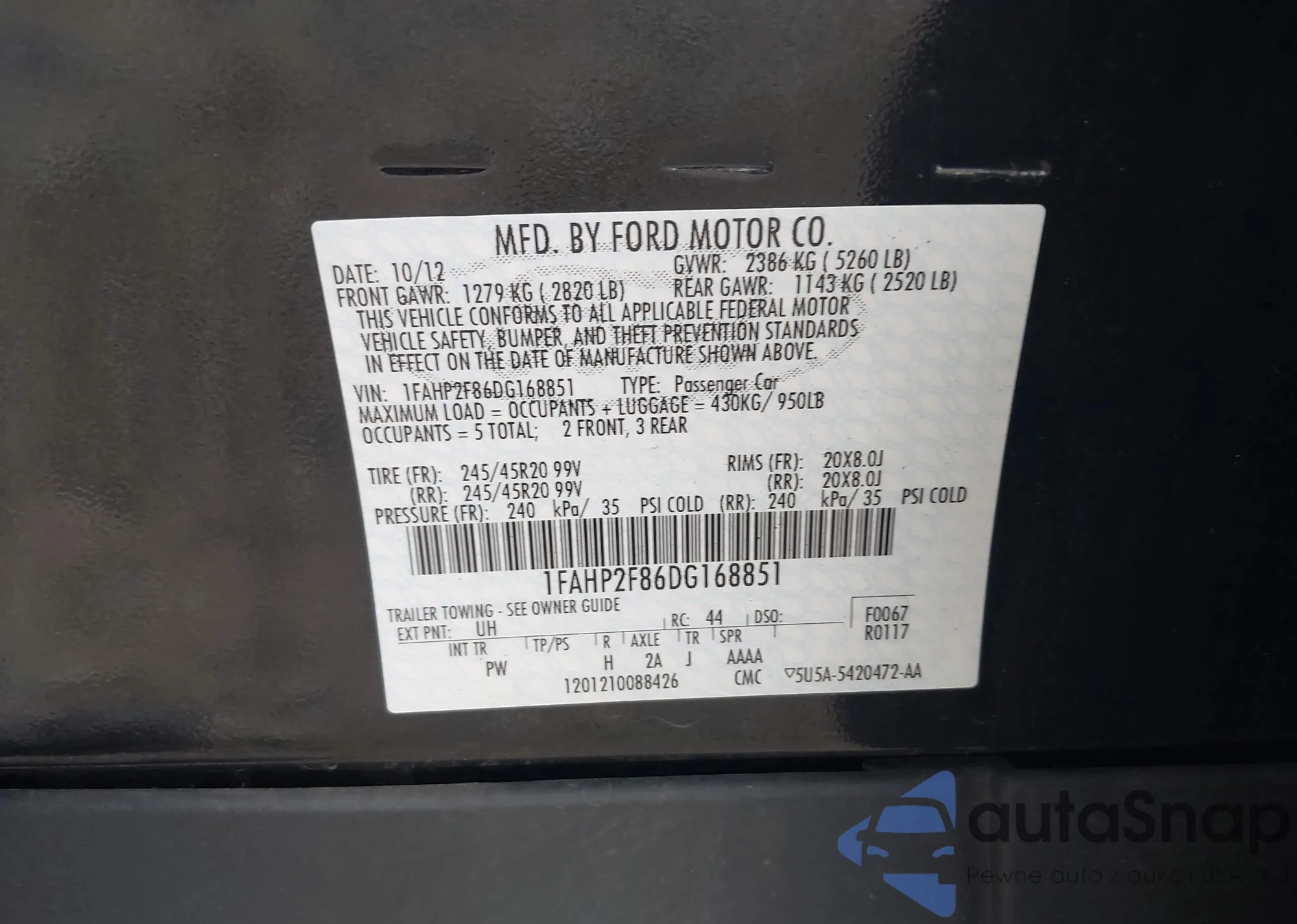 LOT: 43315098 VIN: 1FAHP2F86DG168851