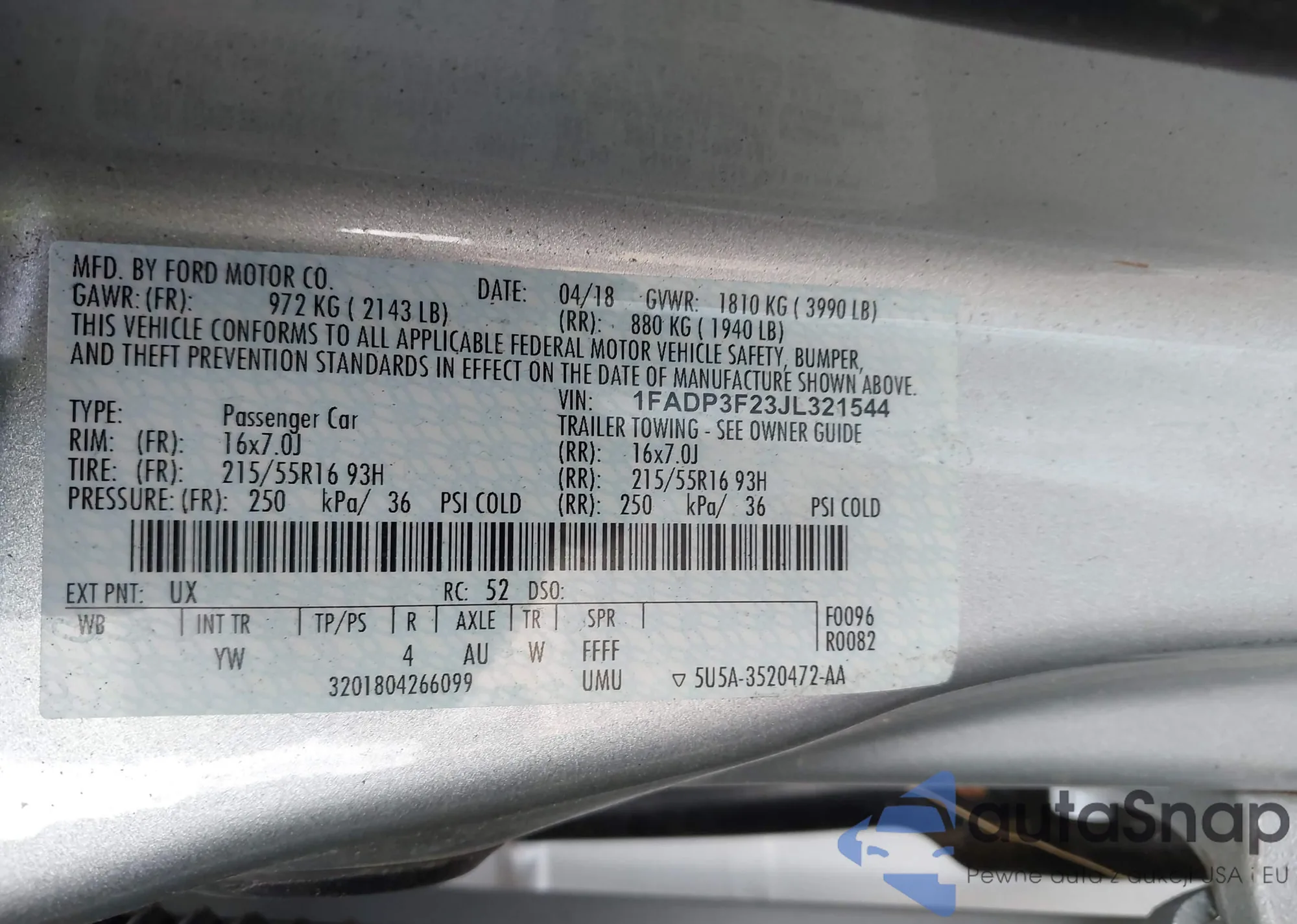 LOT: 43330767 VIN: 1FADP3F23JL321544