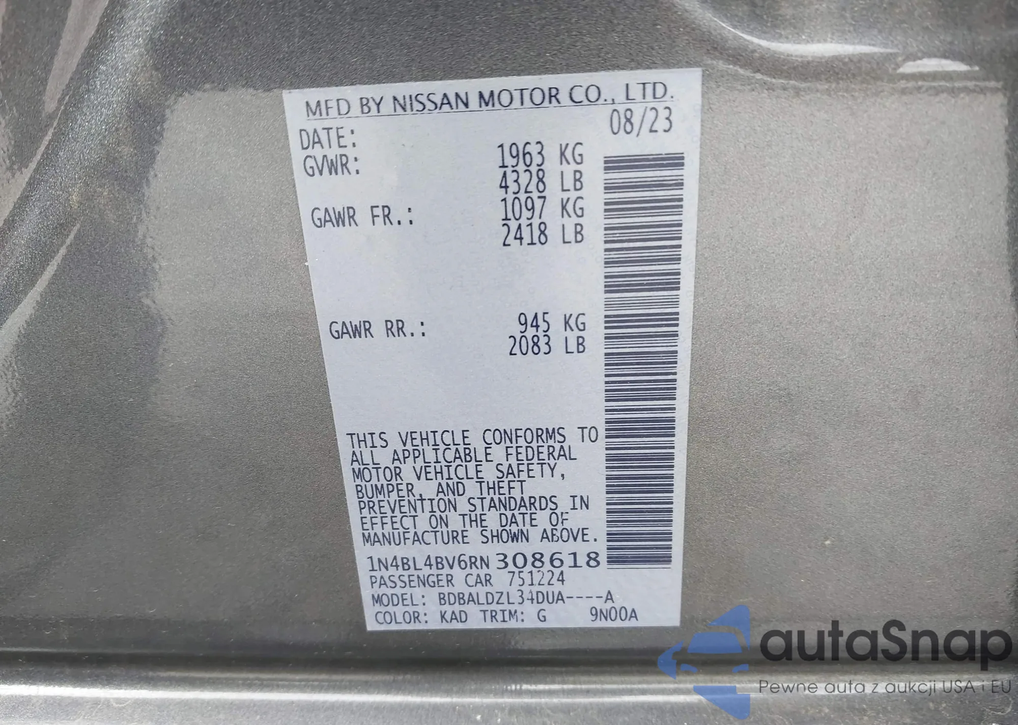 LOT: 43427483 VIN: 1N4BL4BV6RN308618