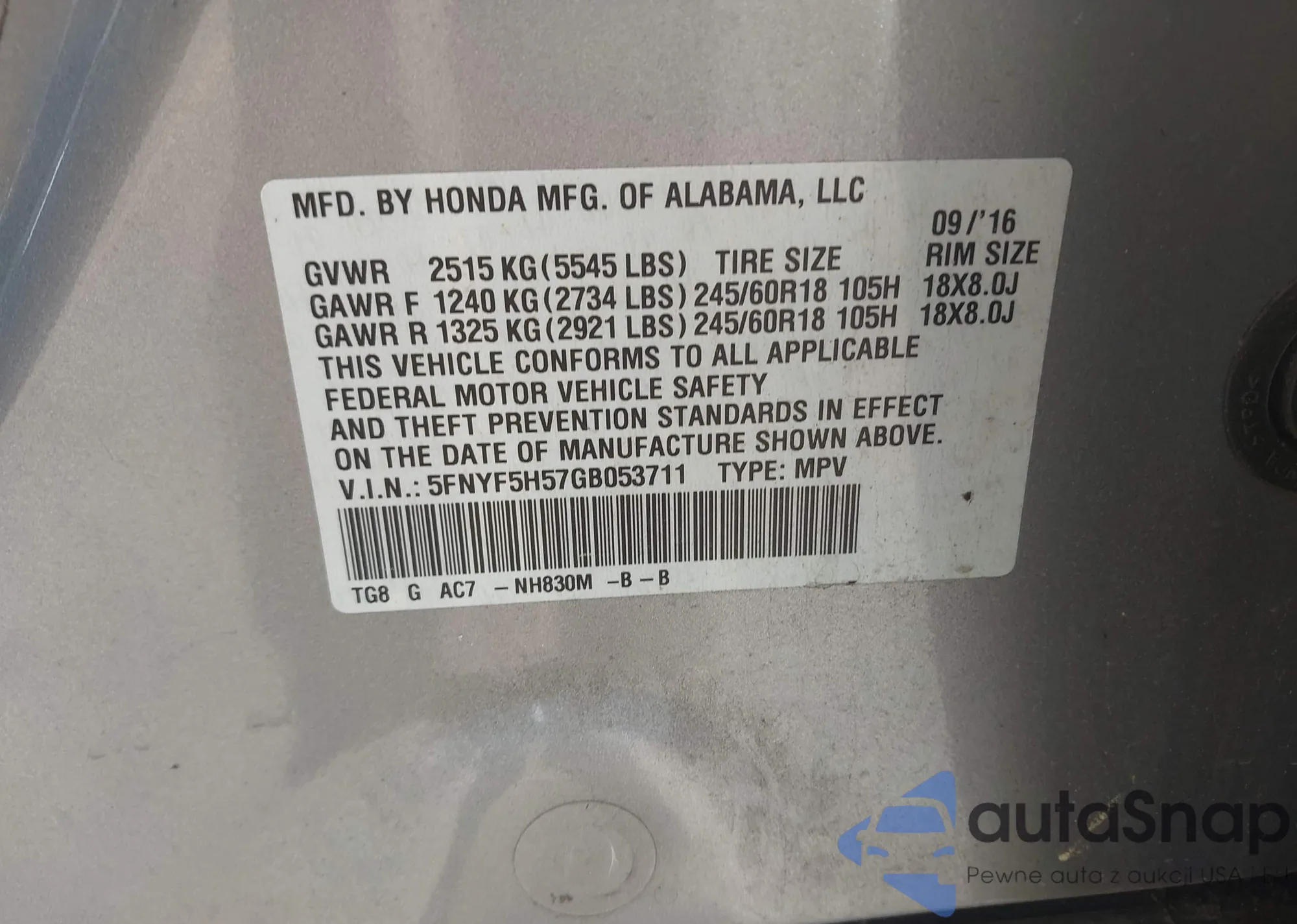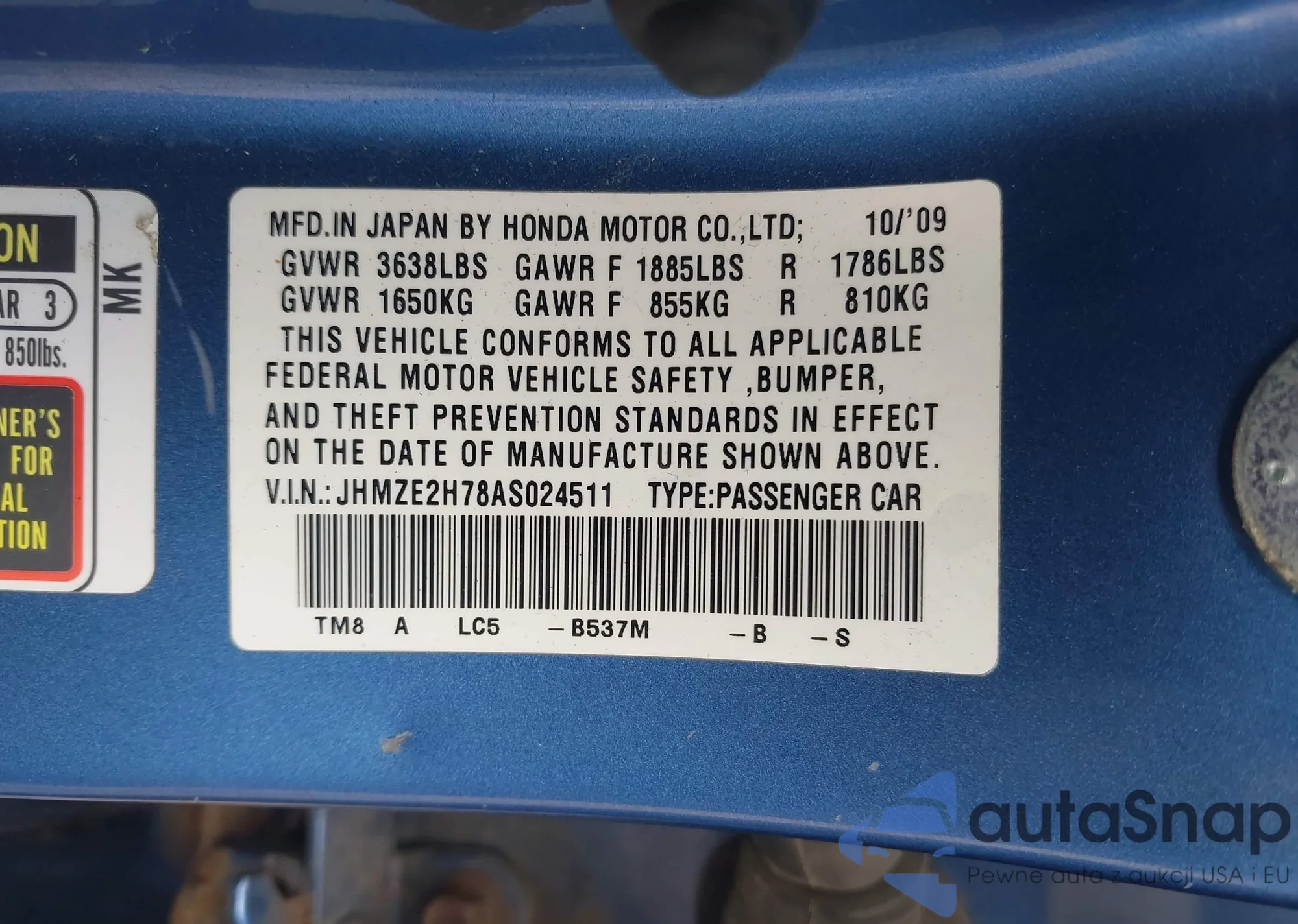 LOT: 43092269 VIN: JHMZE2H78AS024511