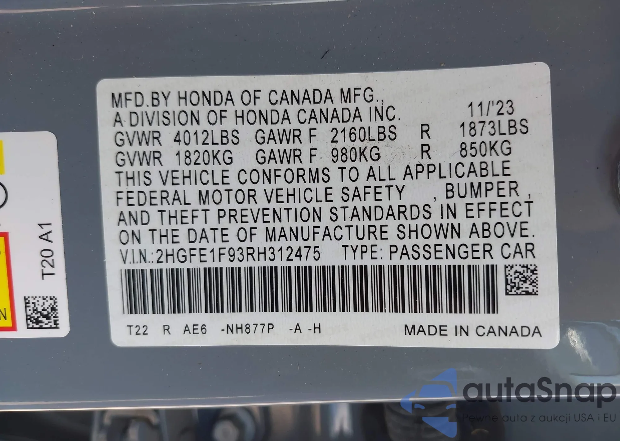 LOT: 43122467 VIN: 2HGFE1F93RH312475