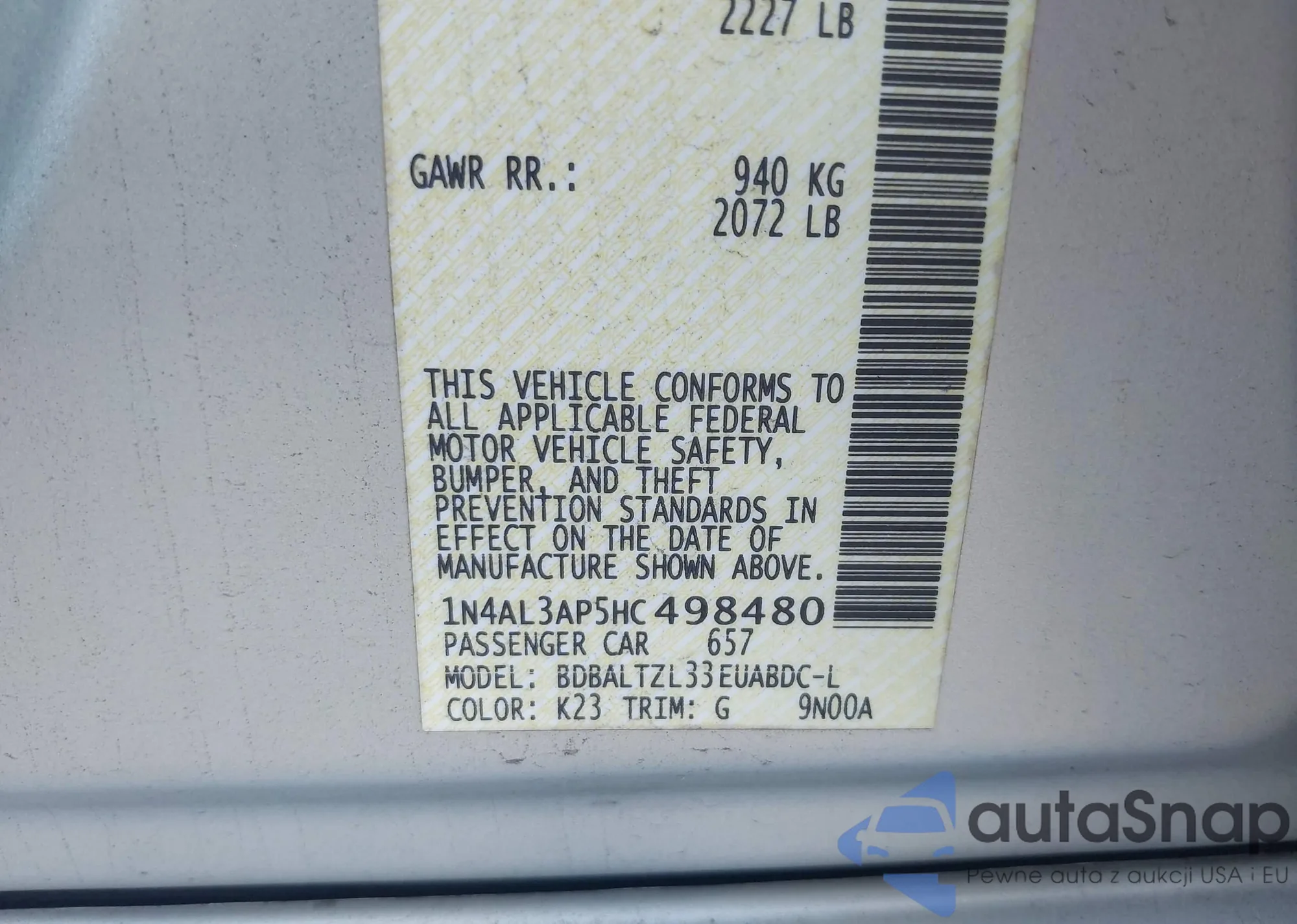 LOT: 43380054 VIN: 1N4AL3AP5HC498480