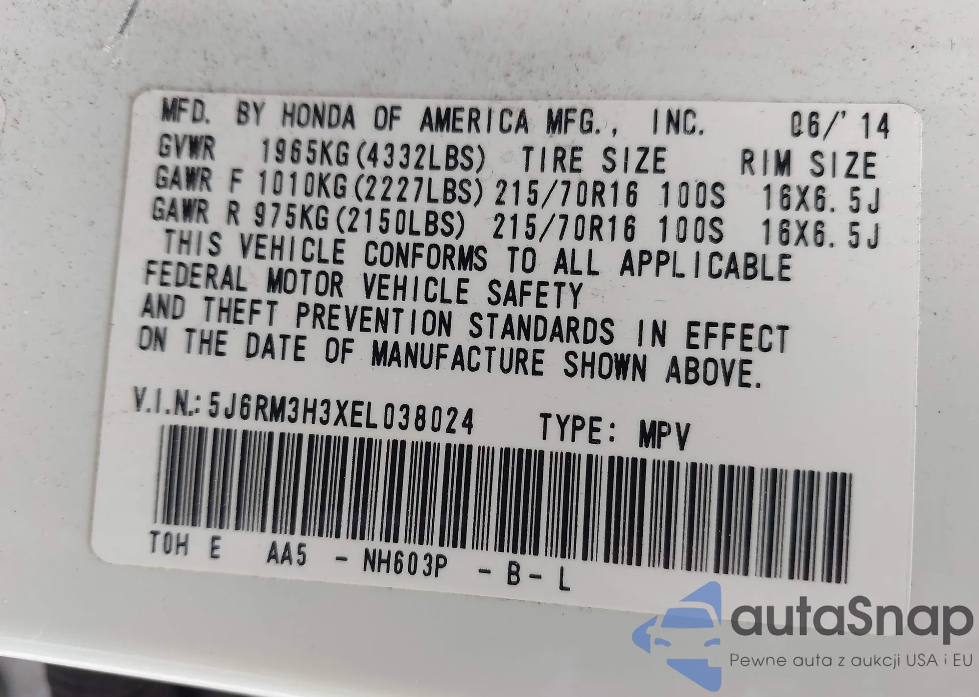 • VIN 1HGCR2F38FA002552