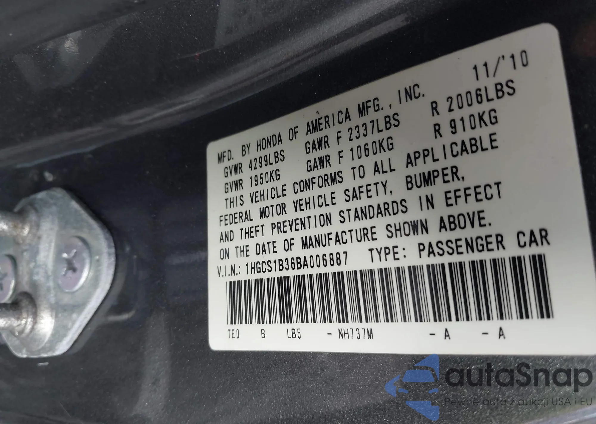 • VIN 1HGCS1B36BA006887