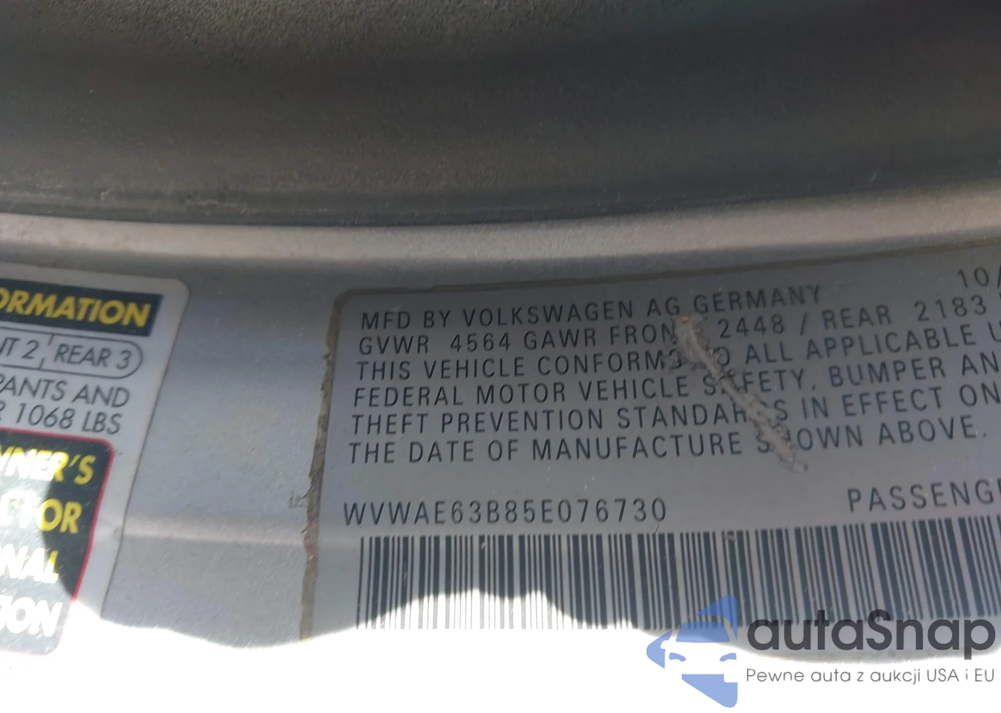 • VIN WVWAE63B85E076730