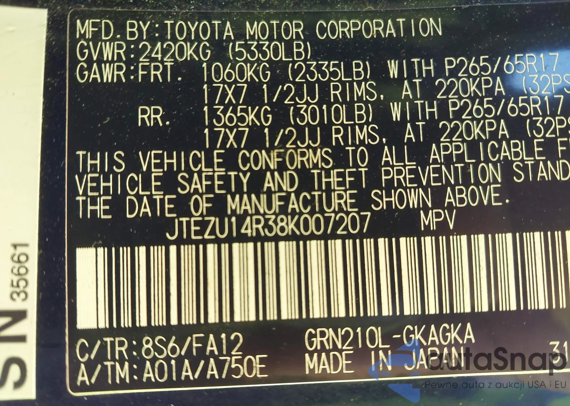 LOT: 43402962 VIN: JTEZU14R38K007207