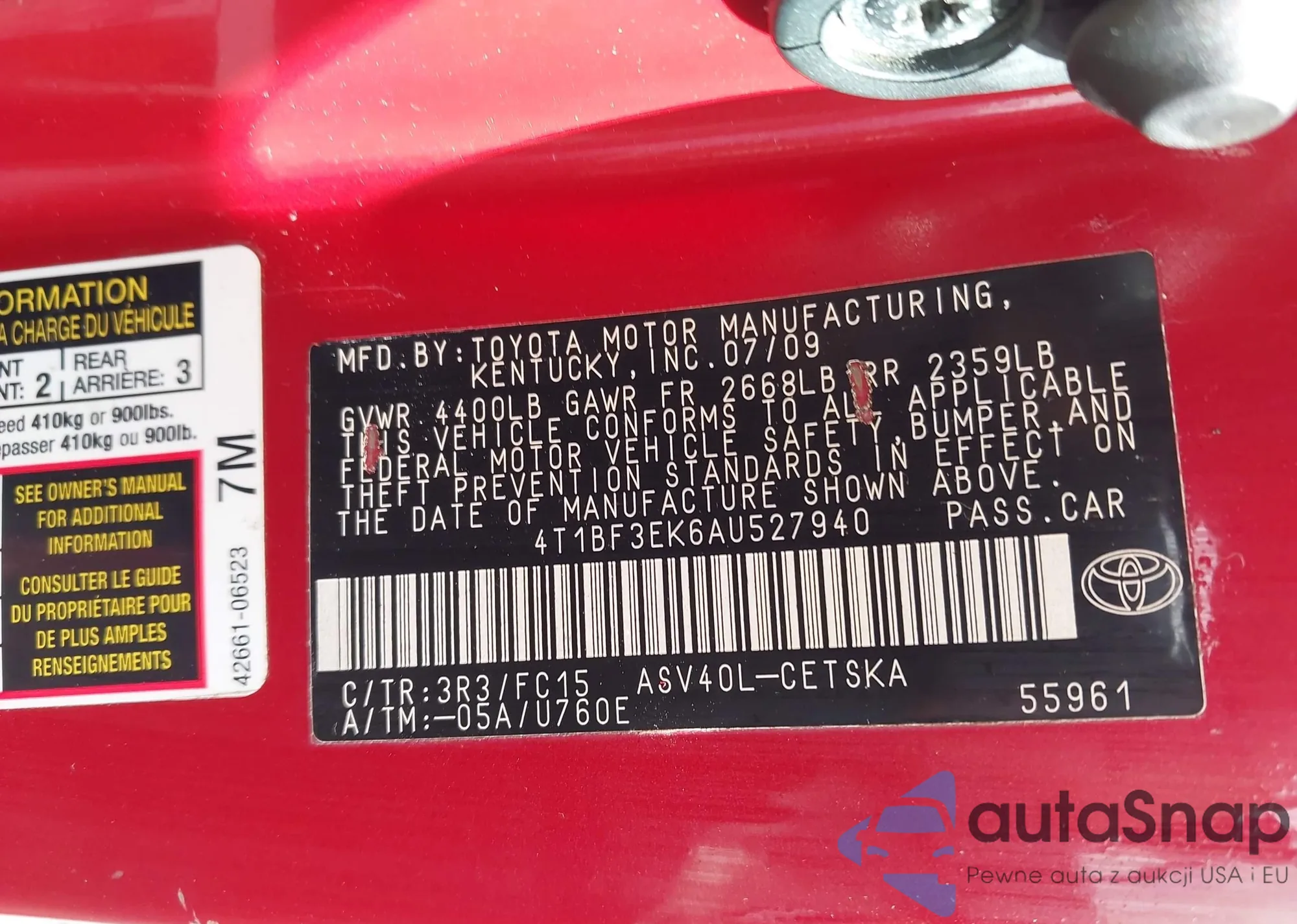 • VIN 4T1BF3EK6AU527940