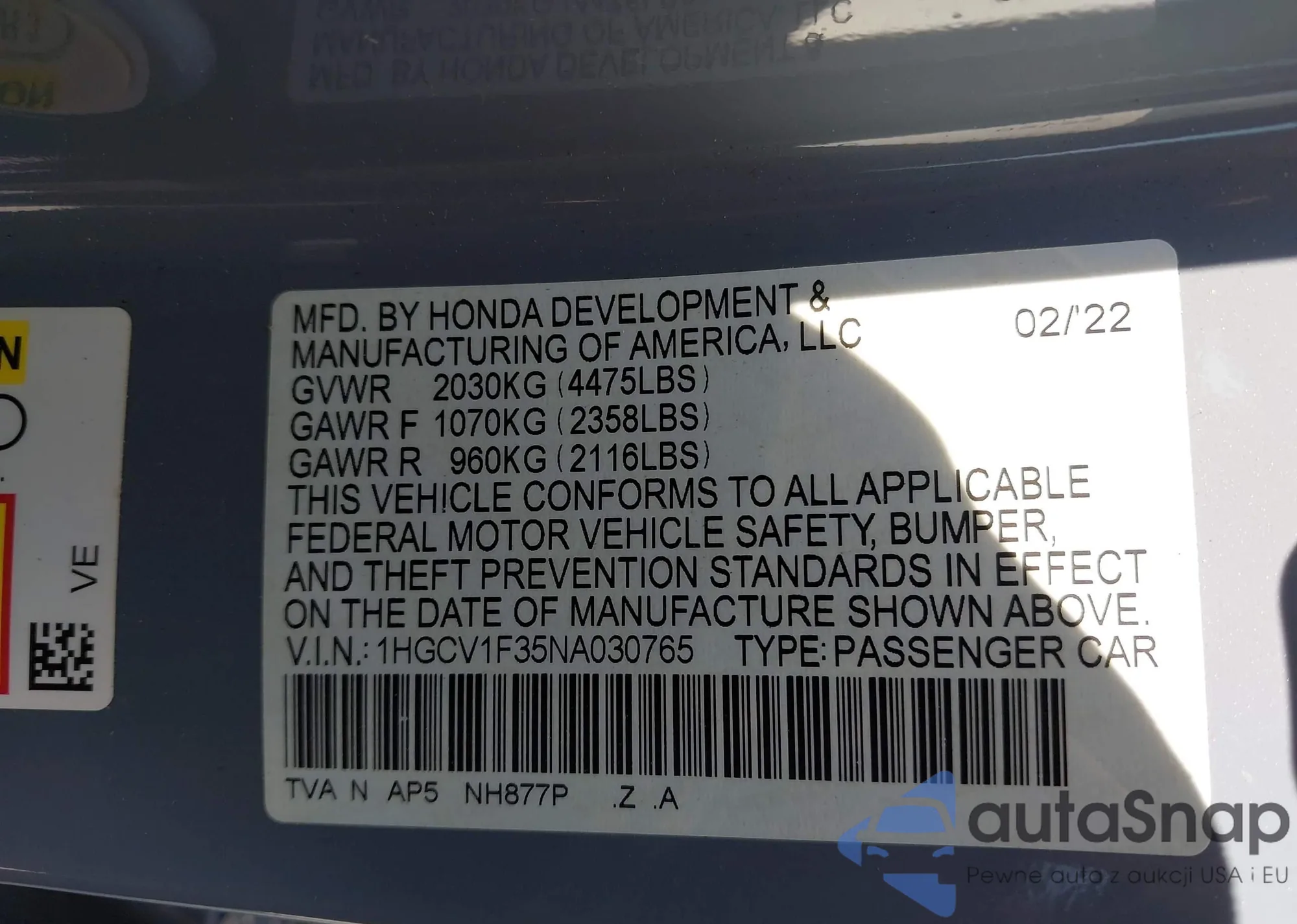 LOT: 43215203 VIN: 1HGCV1F35NA030765