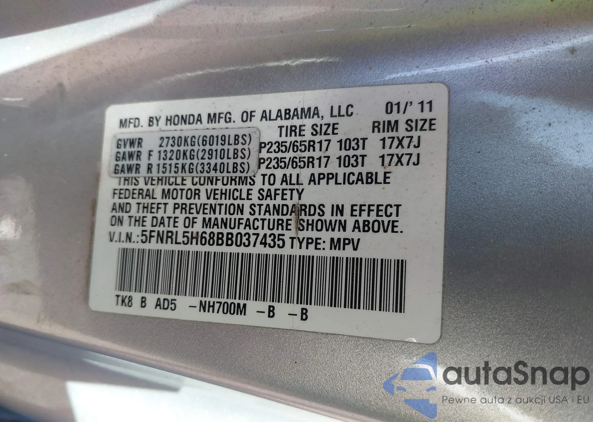 • VIN 5FNRL5H68BB037435