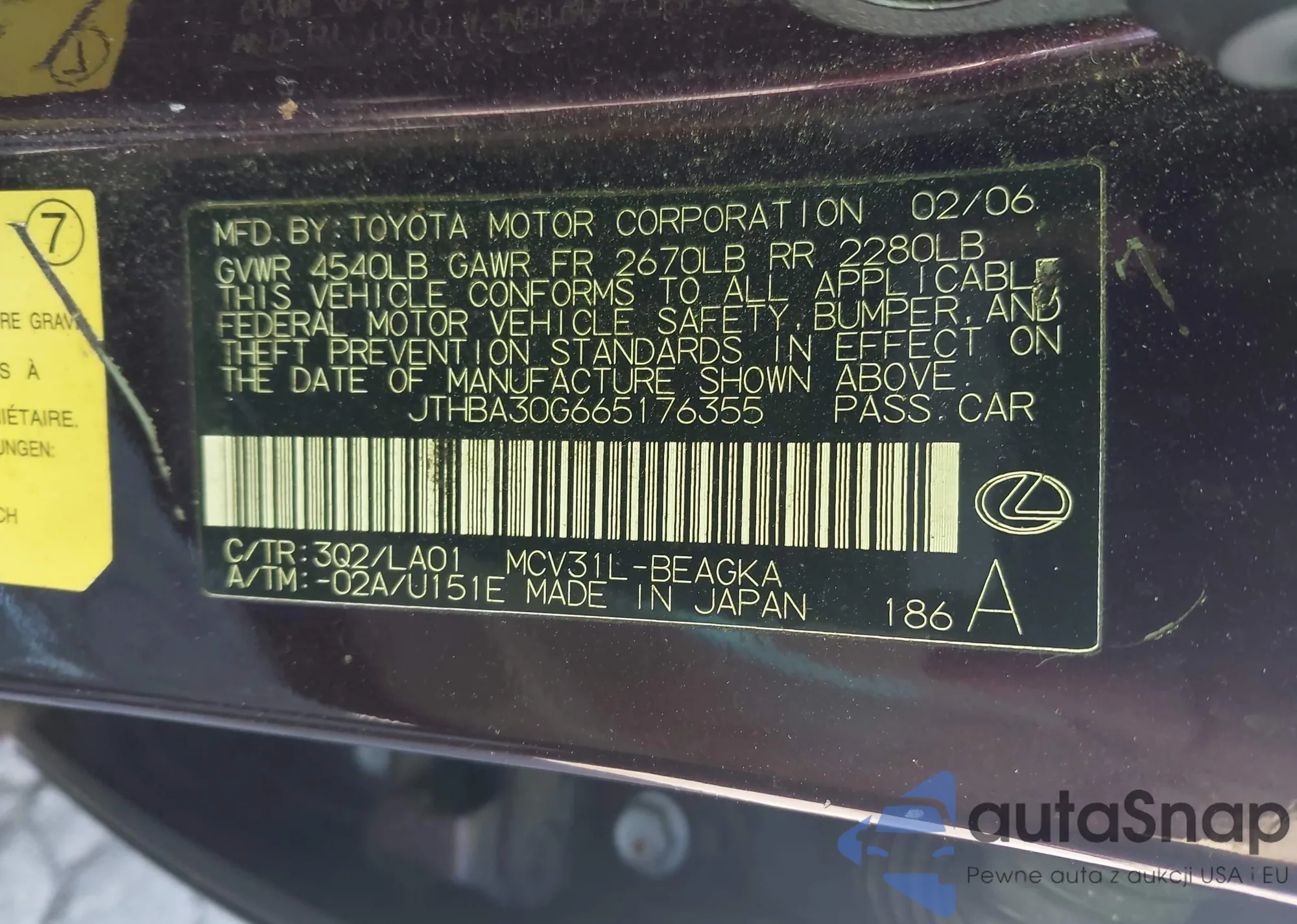 LOT: 43079664 VIN: JTHBA30G665176355