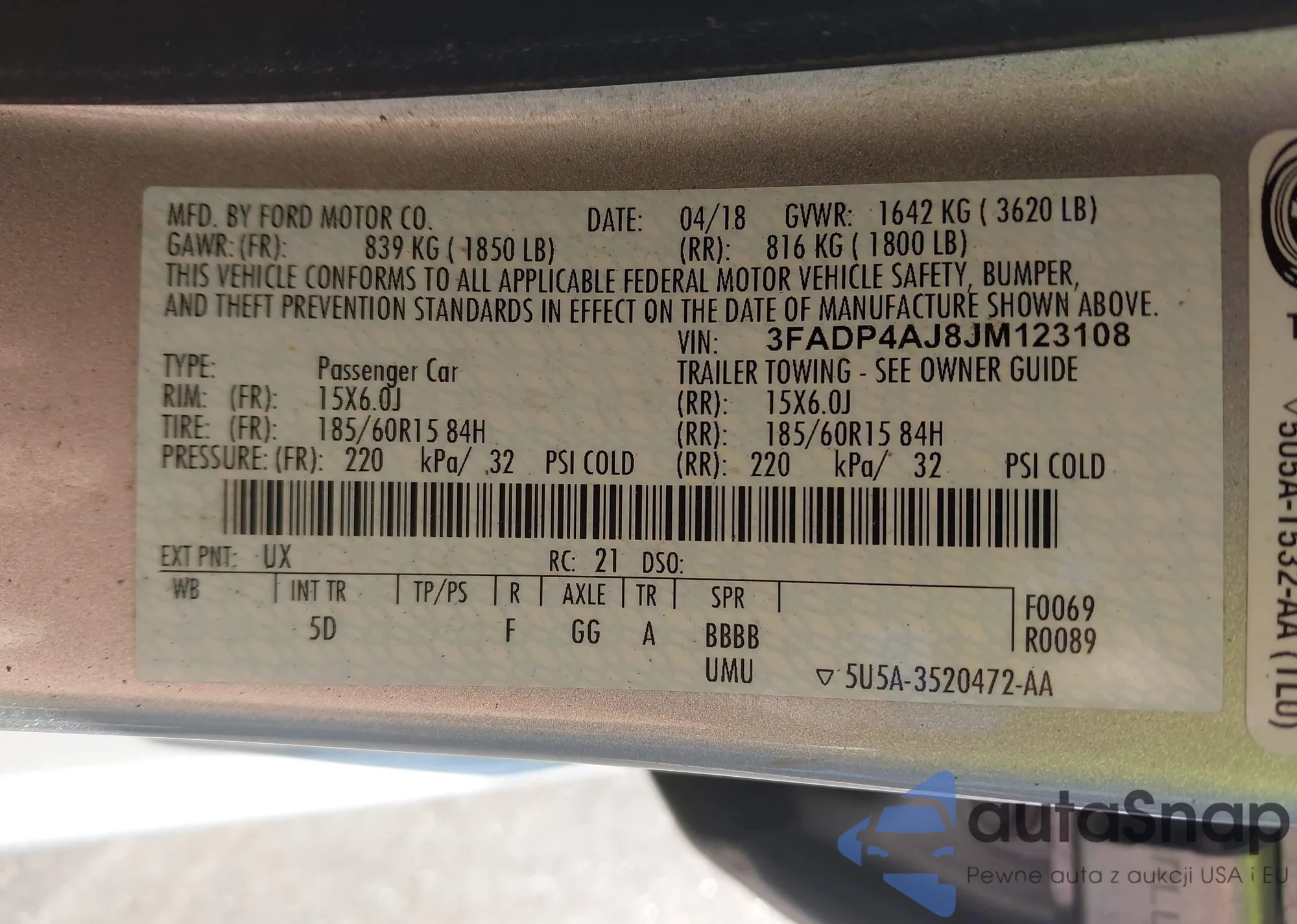 • VIN 3FADP4AJ8JM123108