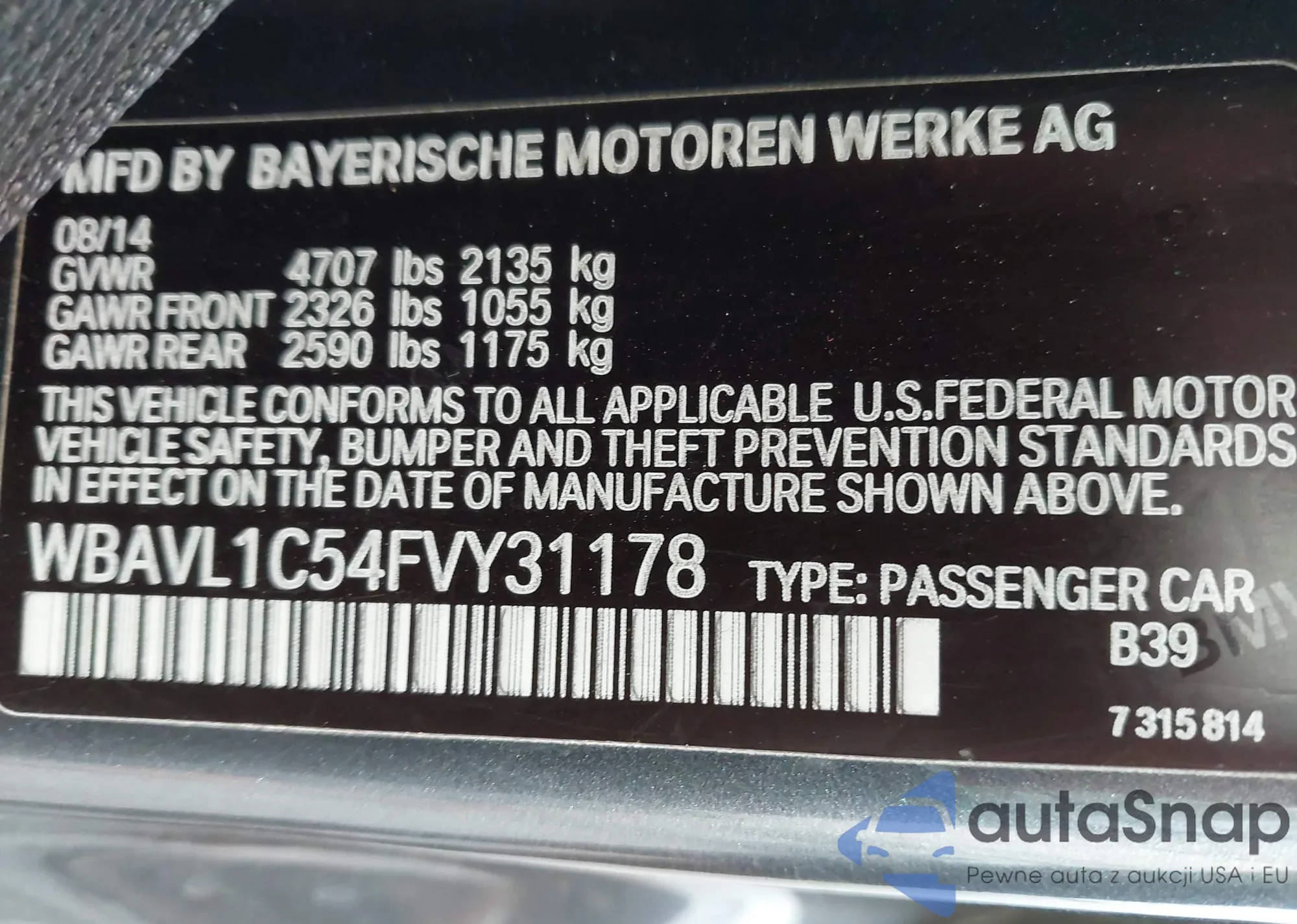 LOT: 42139764 VIN: WBAVL1C54FVY31178