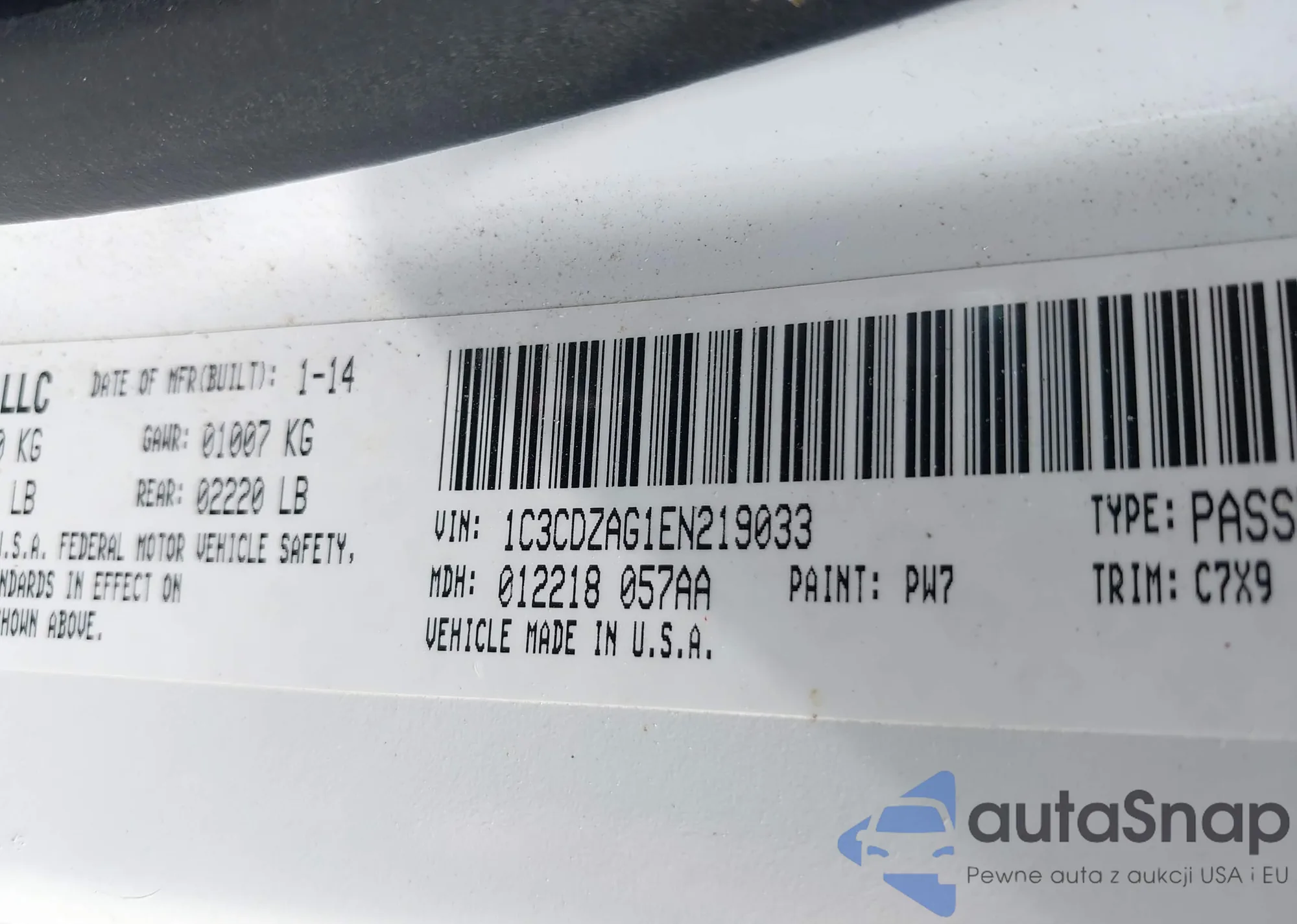 LOT: 43228809 VIN: 1C3CDZAG1EN219033