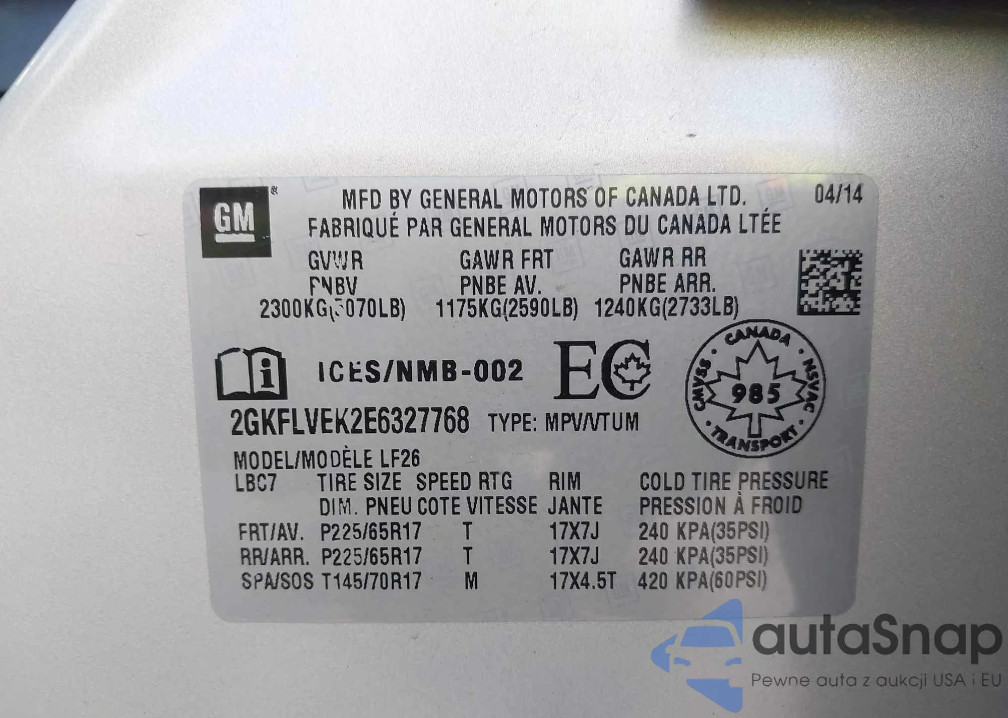 • VIN 2GKFLUEK2E6327768