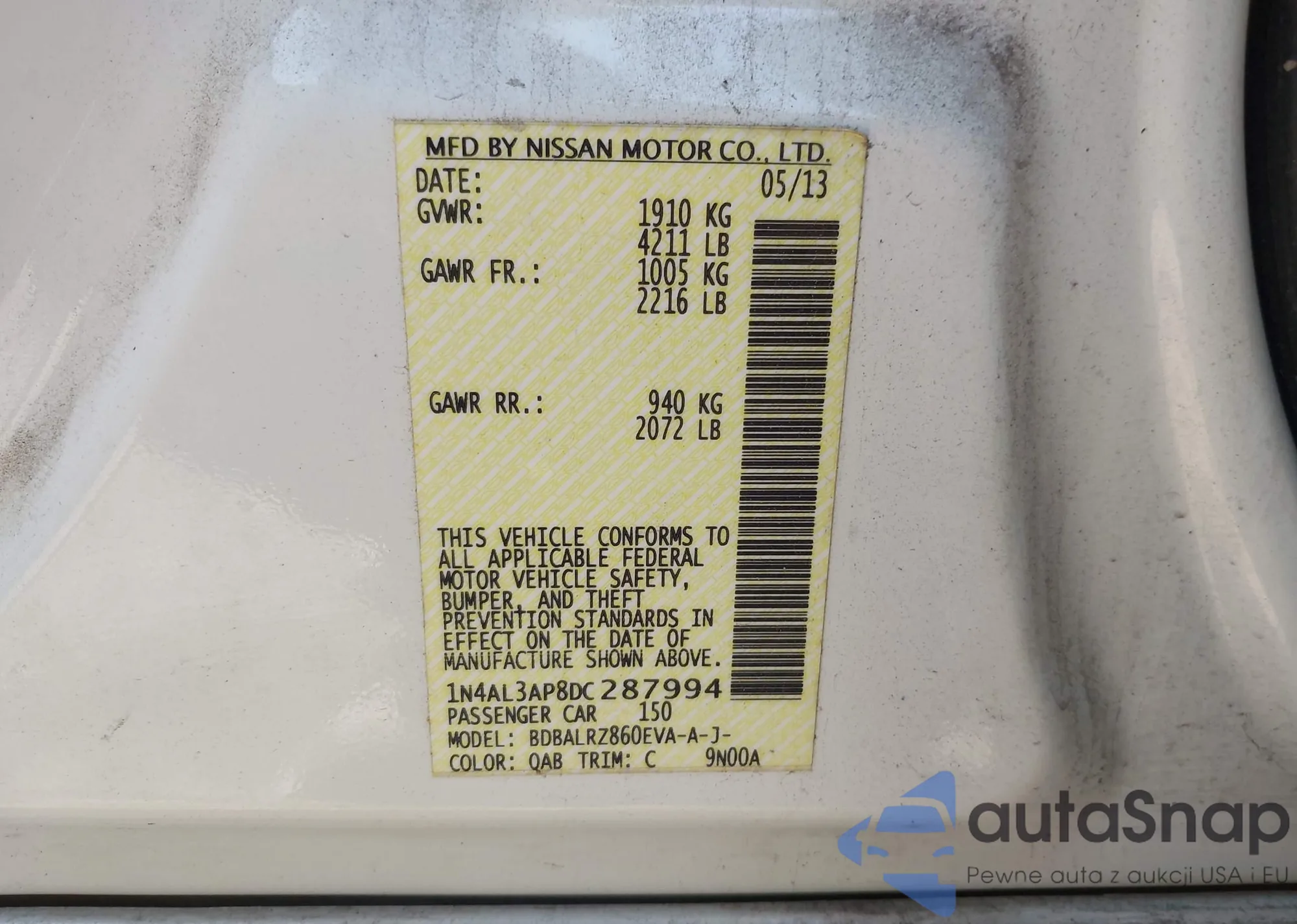 LOT: 43336593 VIN: 1N4AL3AP8DC287994