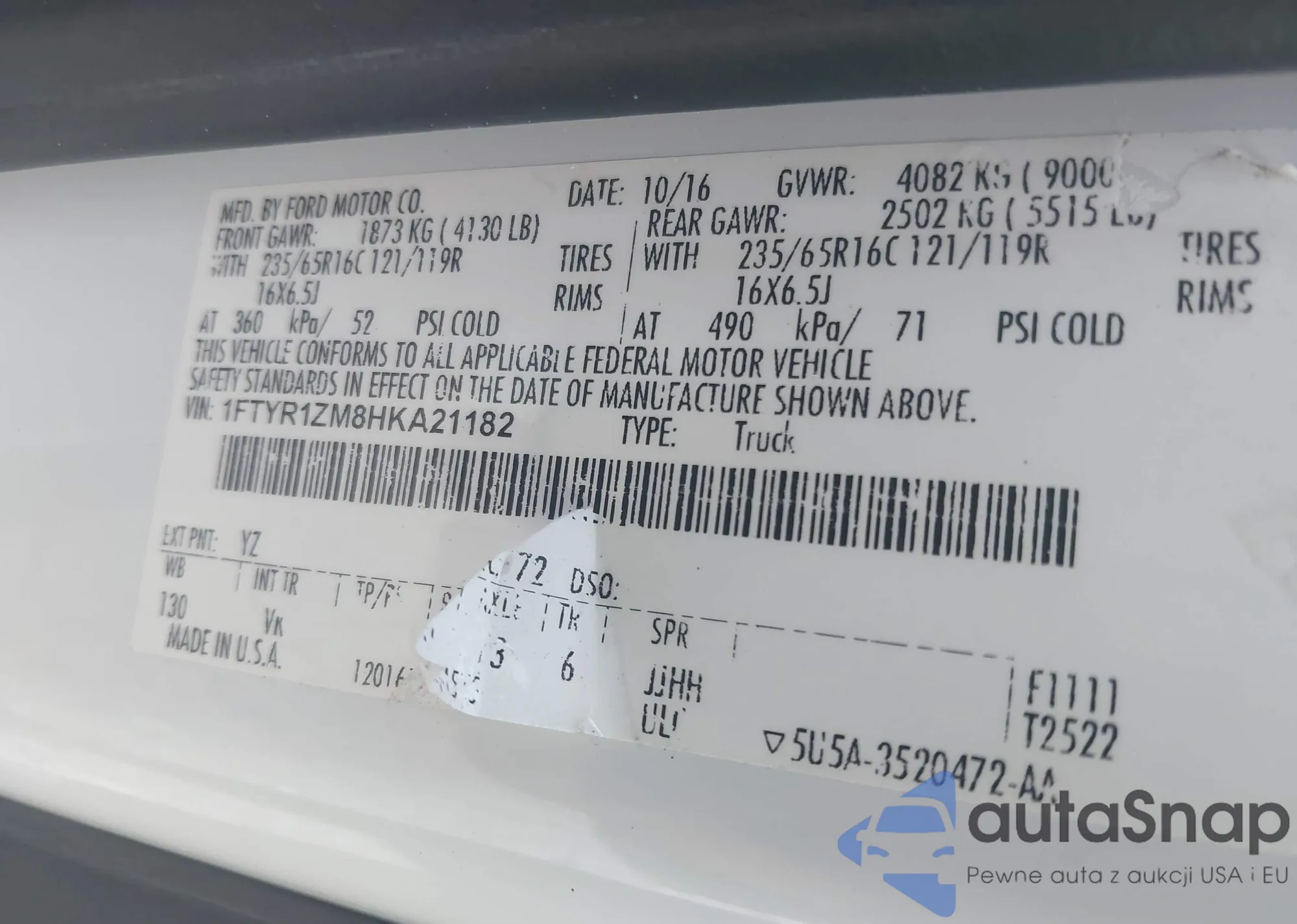 • VIN 1FTYR1ZM8HKA21182