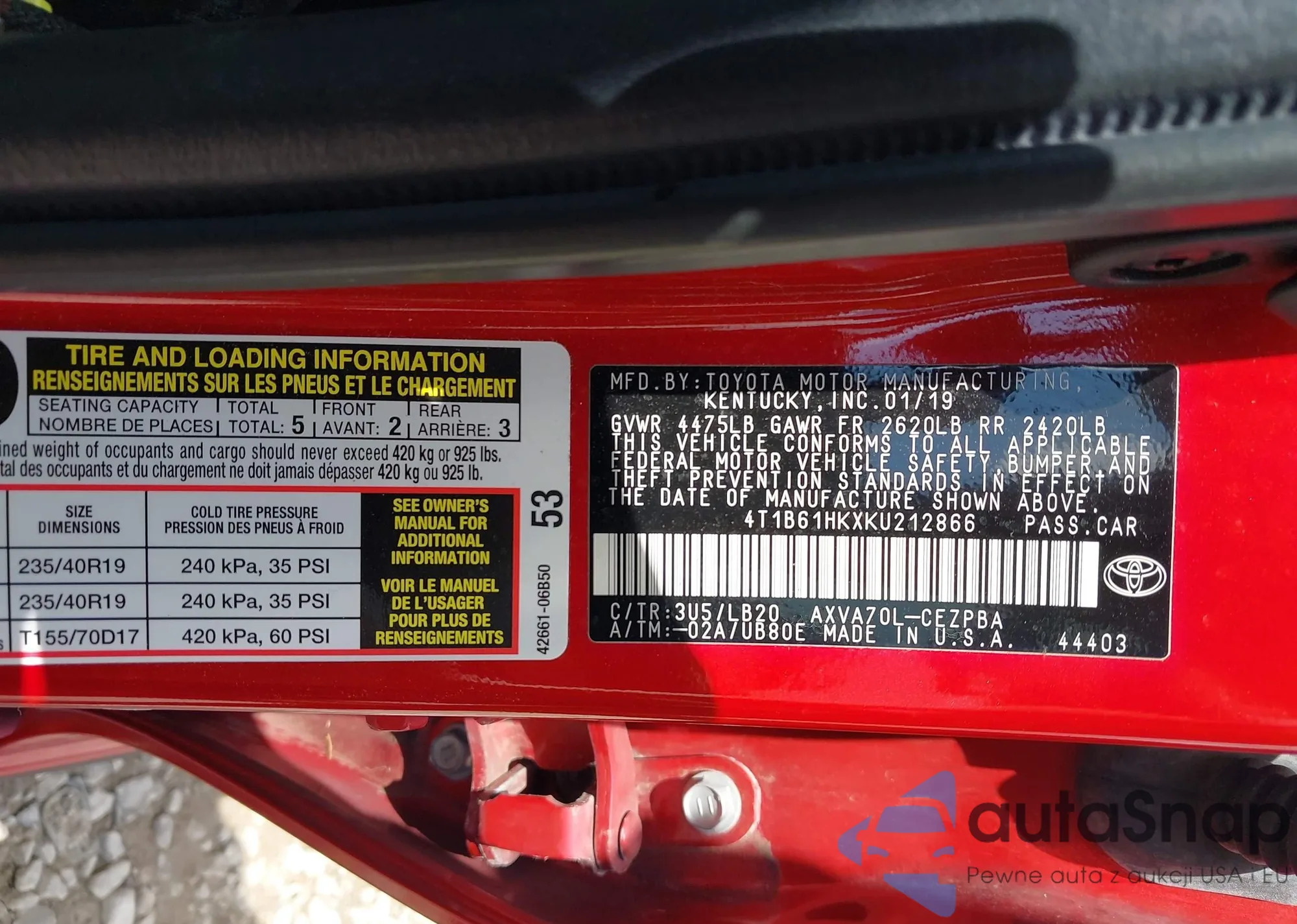 LOT: 42993428 VIN: 4T1B61HKXKU212866