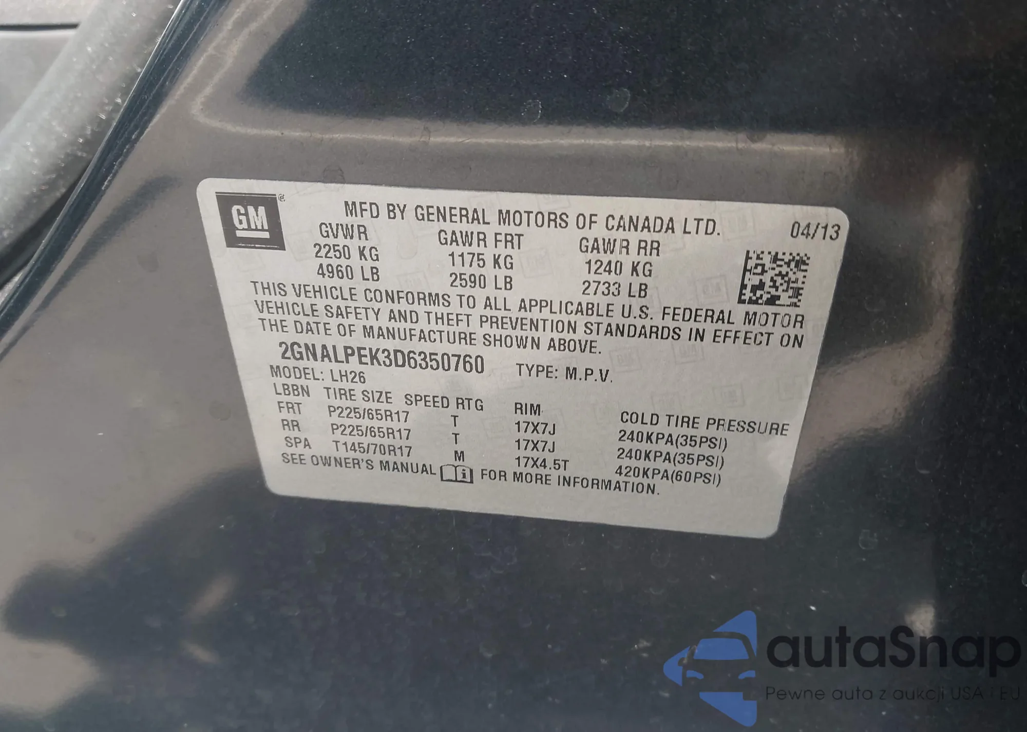 LOT: 43107054 VIN: 2GNALPEK3D6350760