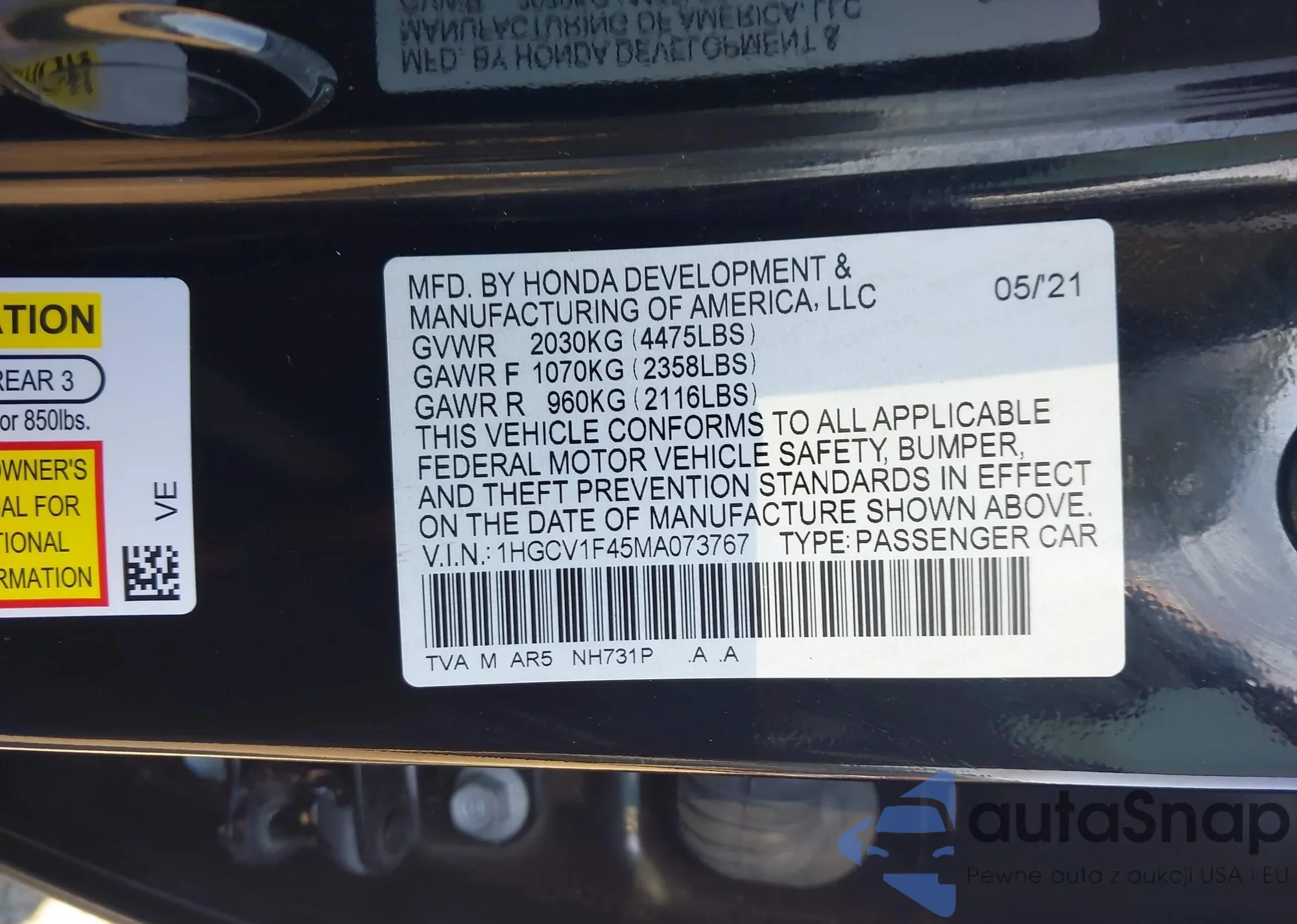 LOT: 43185362 VIN: 1HGCV1F45MA073767