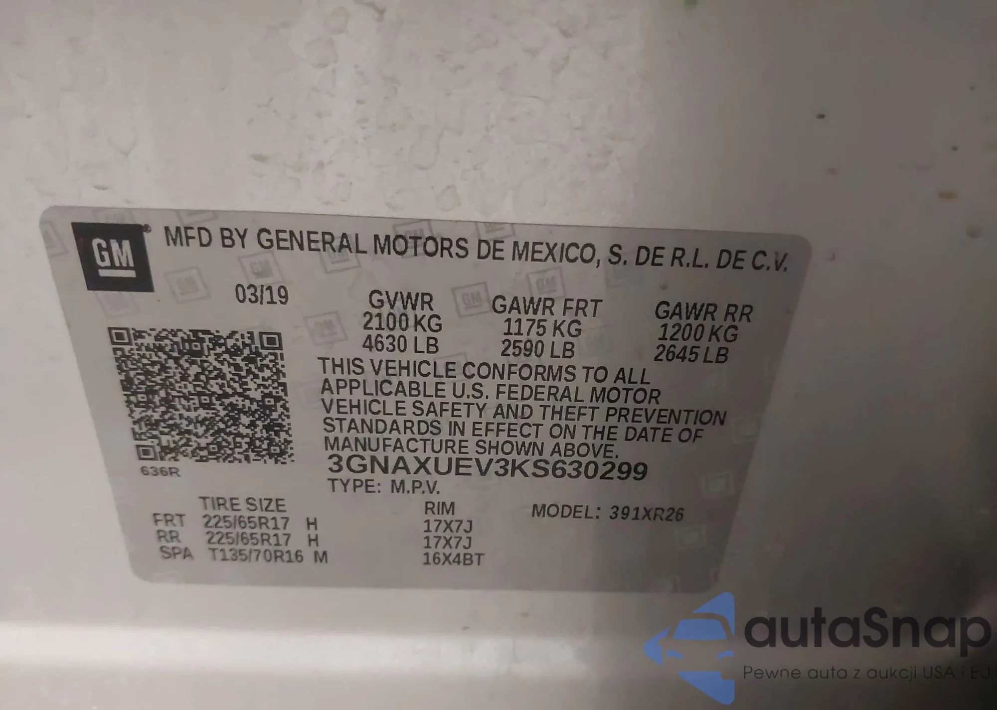 LOT: 42982636 VIN: 2GNAXHEV4K6294443