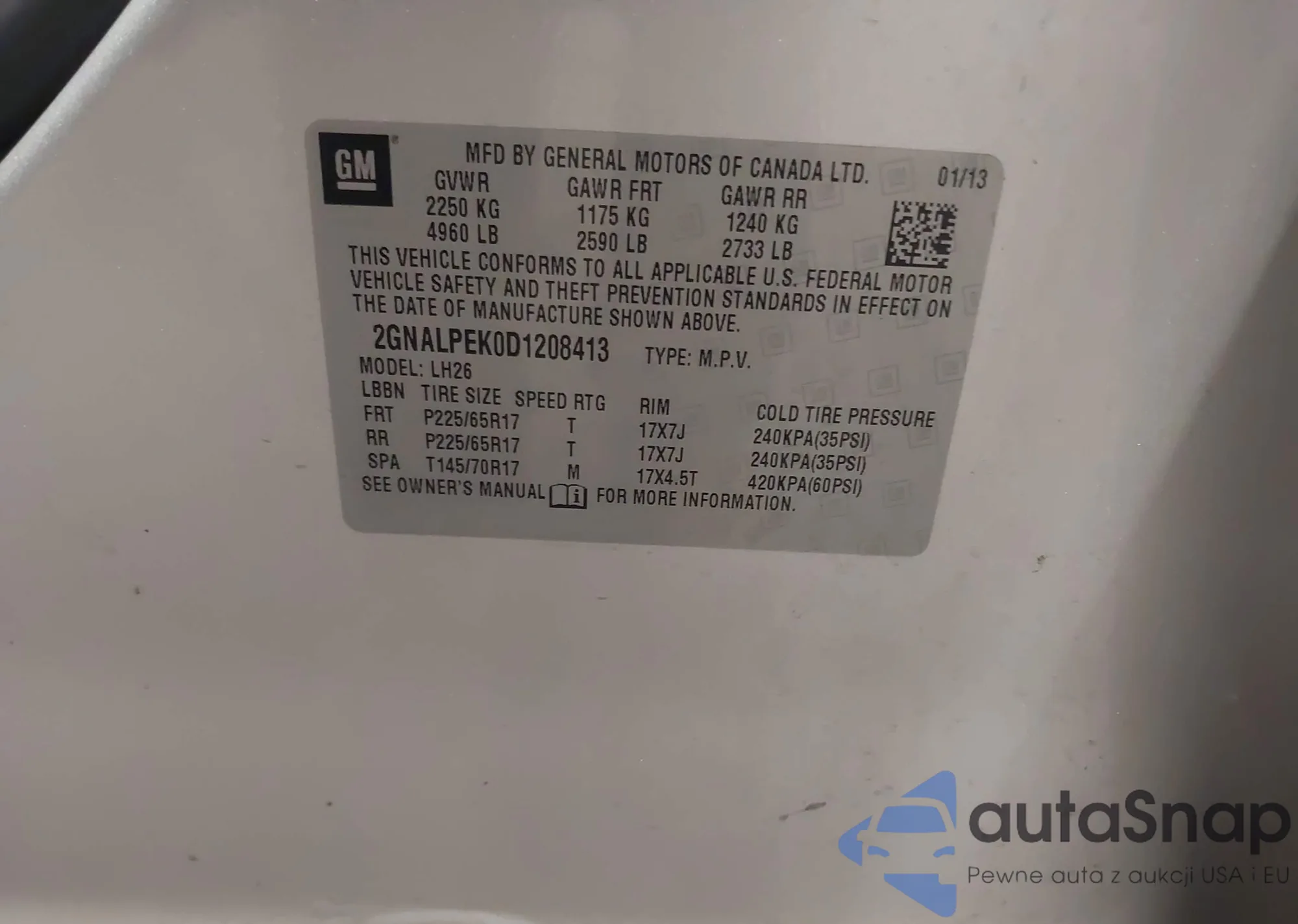 LOT: 43003935 VIN: 2GNALPEK0D1208413